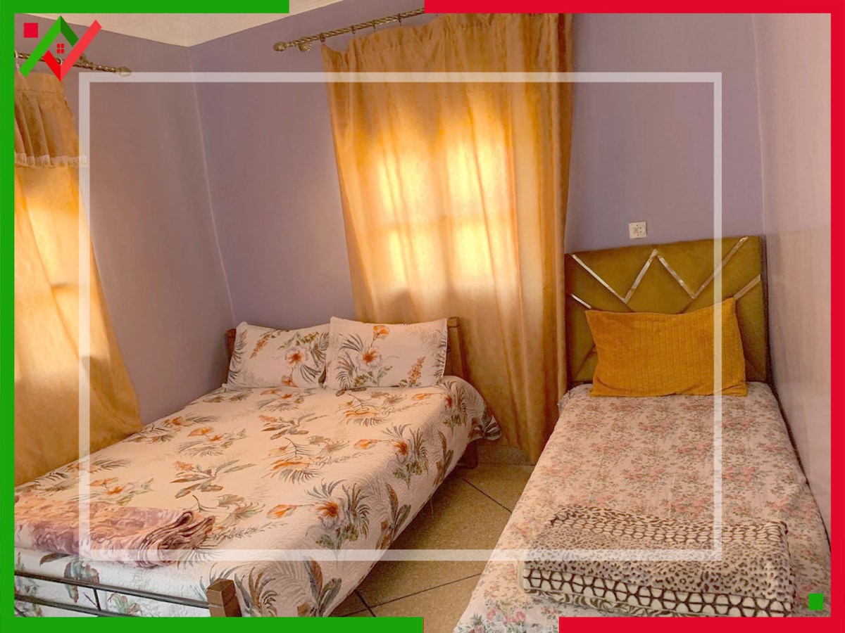 Appartement moderne et calme à Beni Mellal, idéal pour familles ou groupes. Il comprend un grand salon marocain, un petit salon américain, 2 chambres (4 couchages), une cuisine équipée, une douche et 3 grands balcons. Profitez du Wi-Fi fibre, climatisation, machine à laver, TV connectée avec Netflix et électroménagers neufs. Situé dans un quartier paisible, proche des commerces. - me fournir une carte d’identité est très important. - pas d’alcool dans le logement.