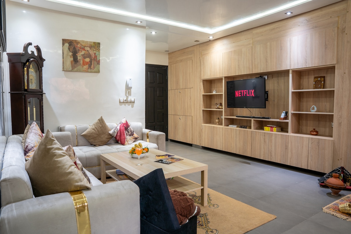 Appartement moderne et calme à Beni Mellal, idéal pour familles ou groupes. Il comprend un grand salon marocain, un petit salon américain, 2 chambres (4 couchages), une cuisine équipée, une douche et 3 grands balcons. Profitez du Wi-Fi fibre, climatisation, machine à laver, TV connectée avec Netflix et électroménagers neufs. Situé dans un quartier paisible, proche des commerces. - me fournir une carte d’identité est très important. - pas d’alcool dans le logement.