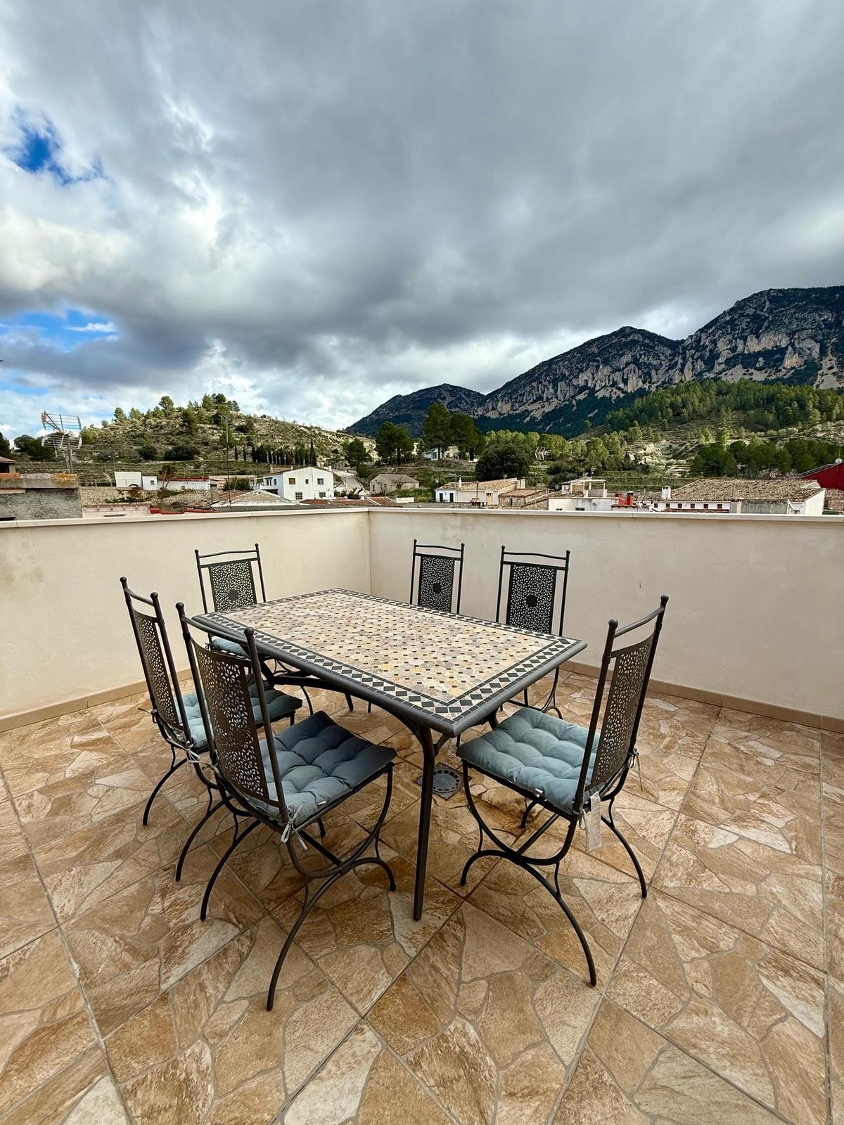 CAPACIDAD PARA 6 PERSONAS, DISTRIBUIDAS EN TRES PLANTAS. En planta baja se encuentra el Salón comedor – cocina, 1 dormitorio y 1 baño de servicio. Toda la estancia con aire acondicionado. Tv. led 55" y Netflix Primera planta, 2 dormitorios con baños en suite, y ventiladores en el techo con mando Segunda planta con una terraza con espectaculares vistas a la sierra de Serrella.