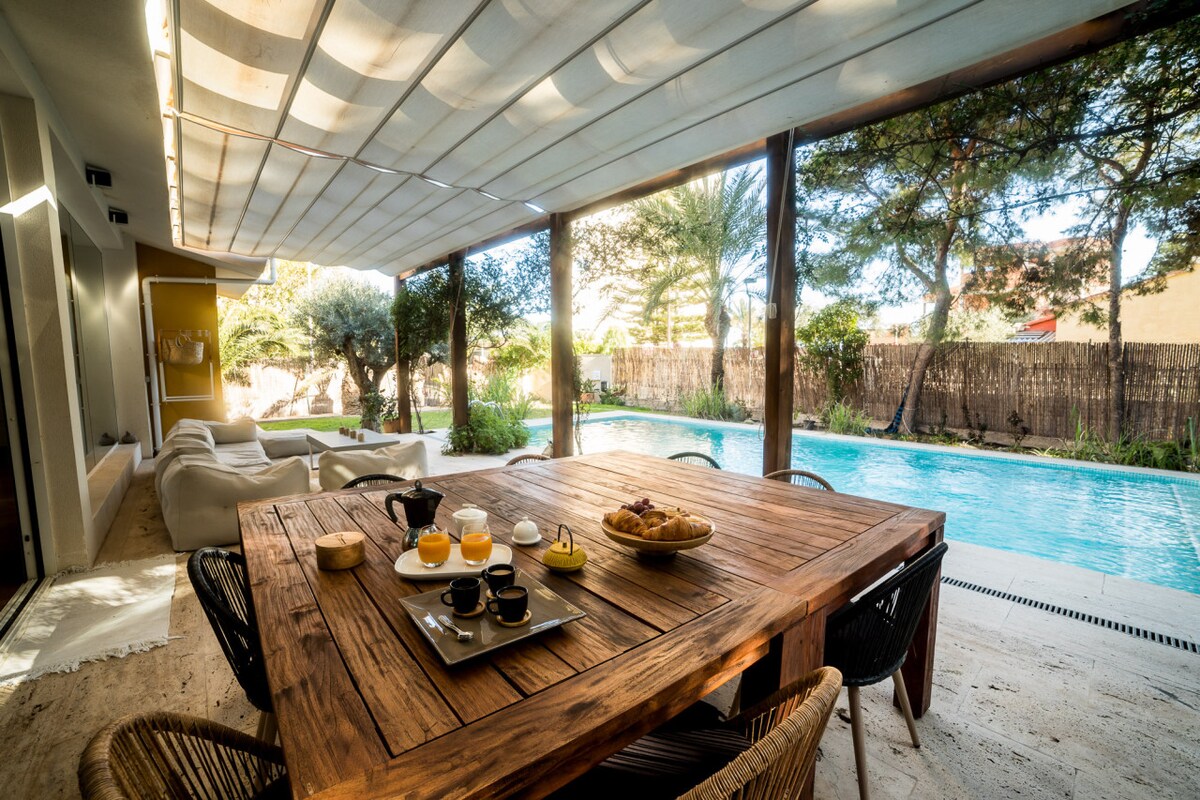 Casa 4 Hab con A/C, a 9’ del Mar, Jardín, Piscina
