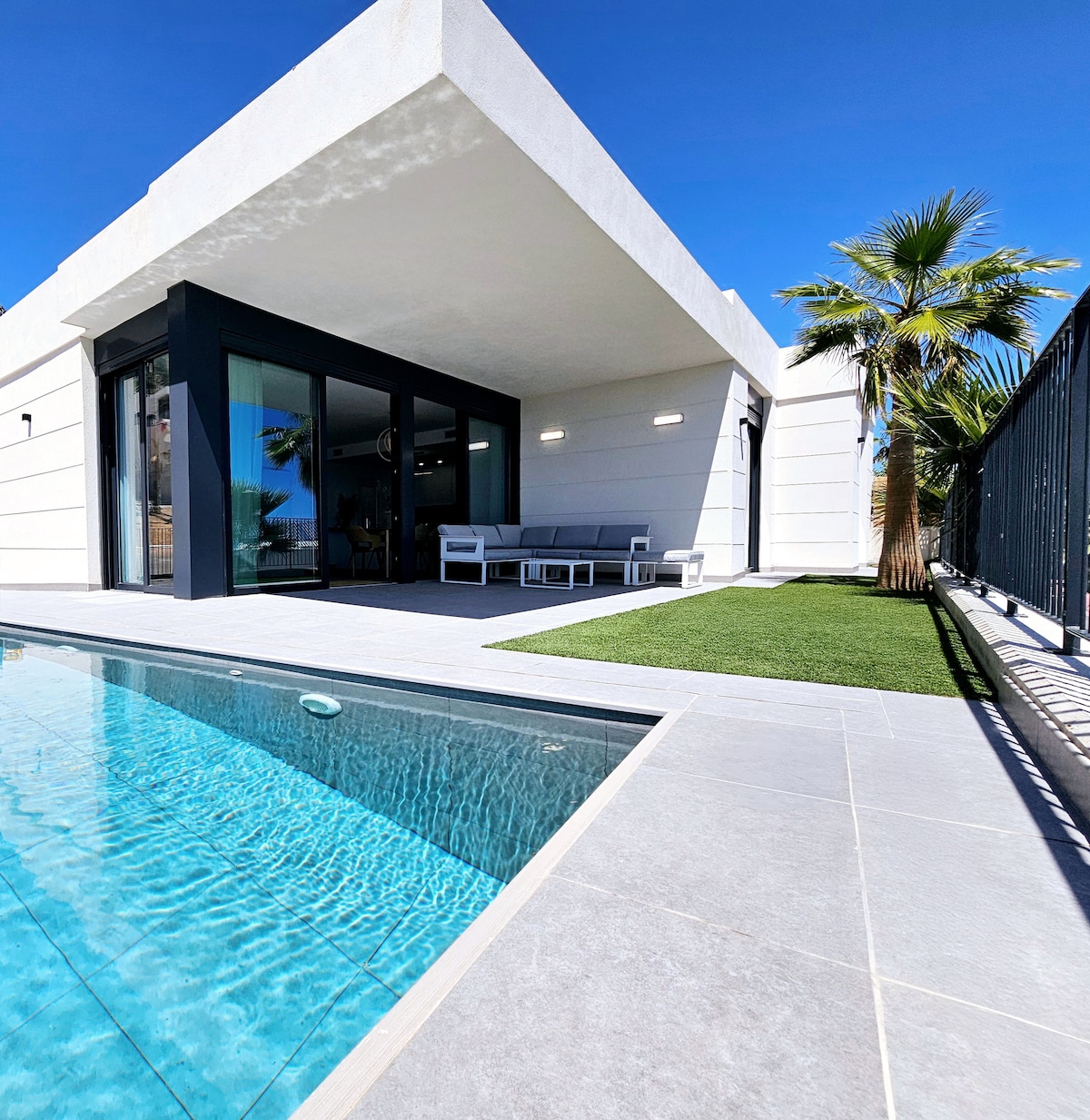 Welcome at home! Your new 250 m² luxury villa with 600 m garden, private swimming pool and BBQ, located in a small and exclusive neighbourhood very close to beach. The tasteful and exclusive interior fittings and furnishings invite you to relax and enjoy every moment, completely undisturbed. There are two Golf Courses at 10 mns drive. Although there are two bus lines or it's easy to get a taxi to come at the door house, it is preferable to have a car to go to the beach or Alicante.