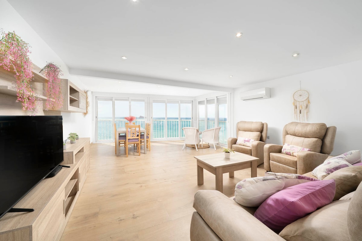 120 m² beachfront apartment, on the 21st floor corner, with open Mediterranean views from almost every room. A rare find in Benidorm for its space, location and privacy. Wake up facing the sea, enjoy breakfast with natural light and end the day with a glass of wine at sunset. Recently renovated, bright and thoughtfully designed, with adjustable LED lighting. Communal pool and private parking included.