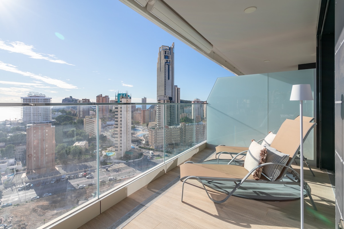Located on the 24th floor, just a few minutes walk from the beach. It features two bedrooms: a master bedroom with an en-suite bathroom and panoramic sea views, and a second bedroom with mountain views. It also has a spacious terrace with stunning sea views. On the 26th floor, you'll find a pool with panoramic sea views, a sauna, and a gym. In the outdoor area, you can enjoy two swimming pools, jacuzzis, a multi-sports court, a children's playground, and padel courts.