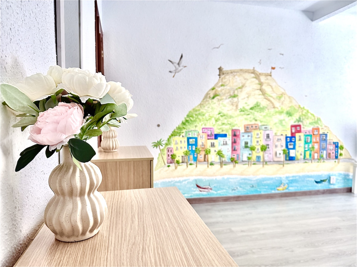 Os presento nuestra Casa, tranquila y céntrica con plaza de Garage y aire acondicionado incluido. Gayfriendly. Totalmente equipada (para niños y bebes ). Situada frente al Castillo, 10 min de la playa del Postiguet y Mercado Central, 5 de la Plaza de toros, y 2 del museo Marq. Parada de tram del Marq a 2 min (directo a Benidorm), y varias paradas de bus. Se encuentra en una zona tranquila alejada del ruido nocturno. Entrada independiente y autónoma (disponible+ métodos de entrada).