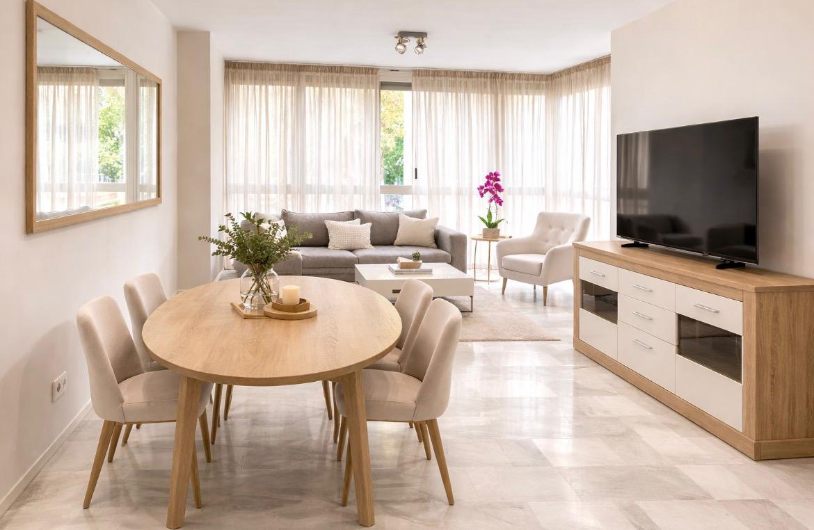 Apartamento a estrenar, totalmente reformado. Decoración con estilo, paredes de hormigón y pintura blanca lisa, armarios de hierro con cristales antiguos, mesas de maderas antiguas recicladas, sofas de lino, cocina de microcemento, con lavavajillas, horno, microondas, lavadora, secadora... Luz ambiente y cálida