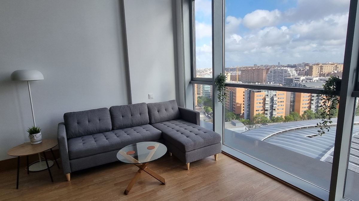 Apartamento Duplex, altura 16 con vista panorámica fantástica y altas prestaciones superiores a un hotel. Totalmente insonorizado, ideal para descansar sin ruidos. Perfecto para parejas como espacio único y exclusivo Junto al centro comercial ARENA con tiendas y restaurantes. Parking privado gratis conectado con el loft por ascensor. Metro y supermercados a 2 min andando.Playa a 5 min en coche. Uso exclusivo parejas : NO se permiten niños ni visitas. WiFi +TV65'' y cocina completa con todo.
