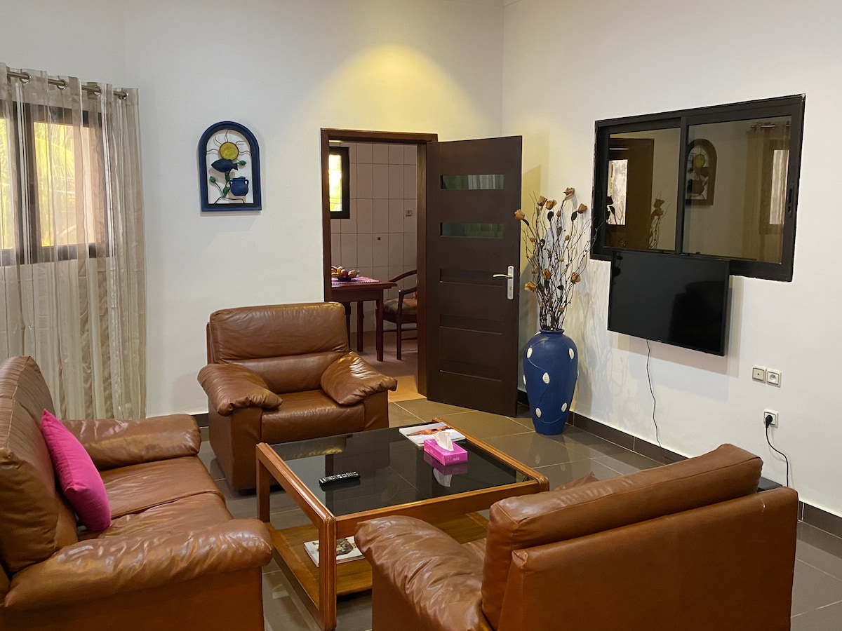 L'appartement est dans une petite résidence de 4 appartements située tout près du carrefour le Bélier à Cotonou,possède deux chambres avec salle de douche privé et tout le confort: télévision par satellite, cuisine équipée avec frigo, plaque de cuisson, micro-onde. Les douches possèdent l'eau chaude. Une terrasse est à disposition pour les repas en plein air. P.S.: L'électricité est à la charge du locataire via un compteur à carte. (prévoir environ 50€ pour 30j selon utilisation....clim ou non)