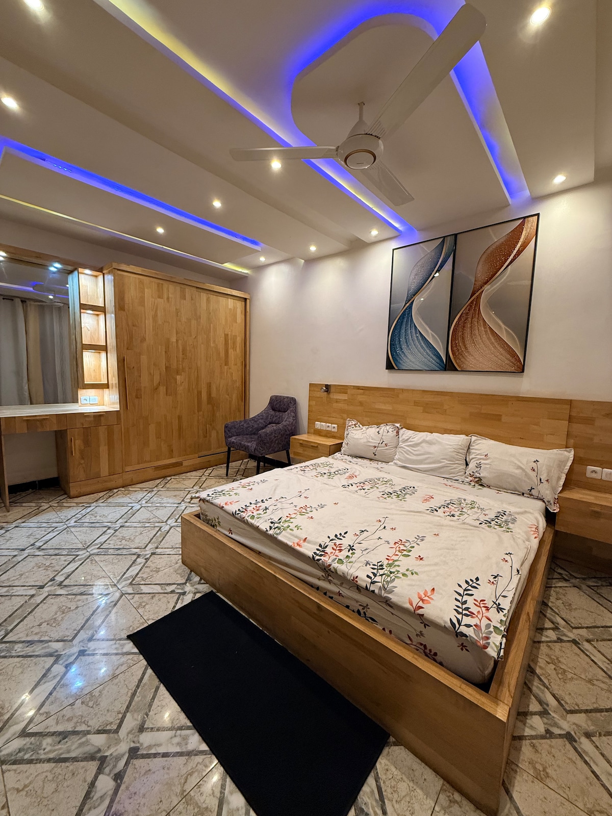 Profitez de cet appartement élégant et spacieux situé en plein cœur de Calavi centre et parfait pour vos séjours. Toutes les pièces sont climatisées, La cuisine dispose de tous les équipements modernes, Le salon est équipé de tv smart et système hifi JVC 2.1 pour agrémenter vos instants de détente, Le Wifi est disponible dans l’appartement Pour les longs séjours , nos agents font le nettoyage général chaque 2 semaines à votre demande.22965284414