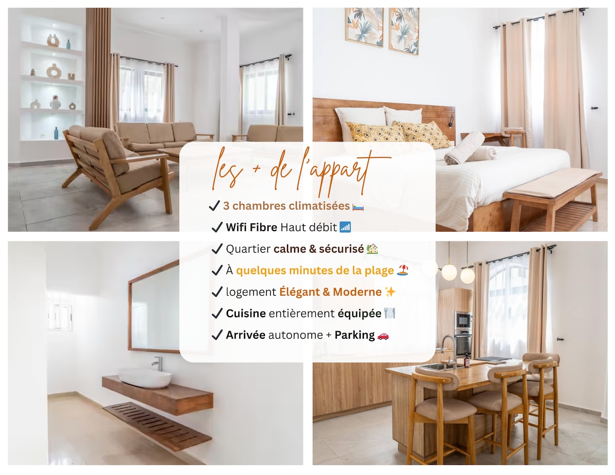 Bienvenue dans votre cocon de sérénité à Fidjrossè, un appartement moderne en duplex, situé à 5 minutes de la plage et 15 minutes de l’aéroport. Calme, lumineux et confortable, le logement se trouve à proximité des restaurants de la route des Pêches, ainsi que des commerces et supermarchés accessibles à pied. Idéal pour un séjour en famille, entre amis ou professionnel. ⚠️ À noter : le logement est un duplex avec escaliers intérieurs et peut ne pas convenir aux personnes à mobilité réduite.
