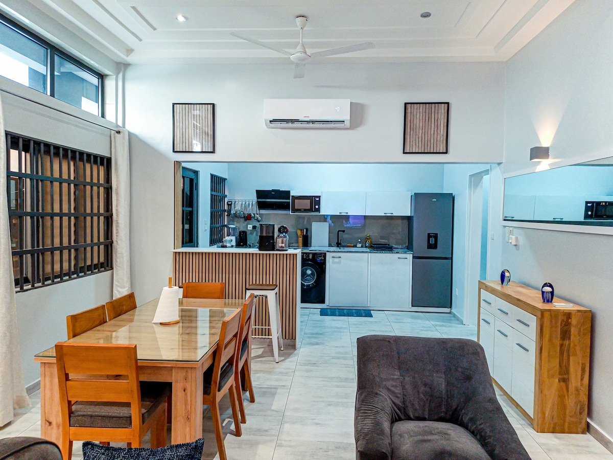 Maison élégante et agréable, elle est idéale pour les familles et grands groupes. Elle est située dans un quartier en pleine expansion, proches de différentes commodités, à 15 min de l'aéroport et de l'océan. Le cadre est paisible grâce à son environnement non bruyant et son accès à la piscine et jardin.