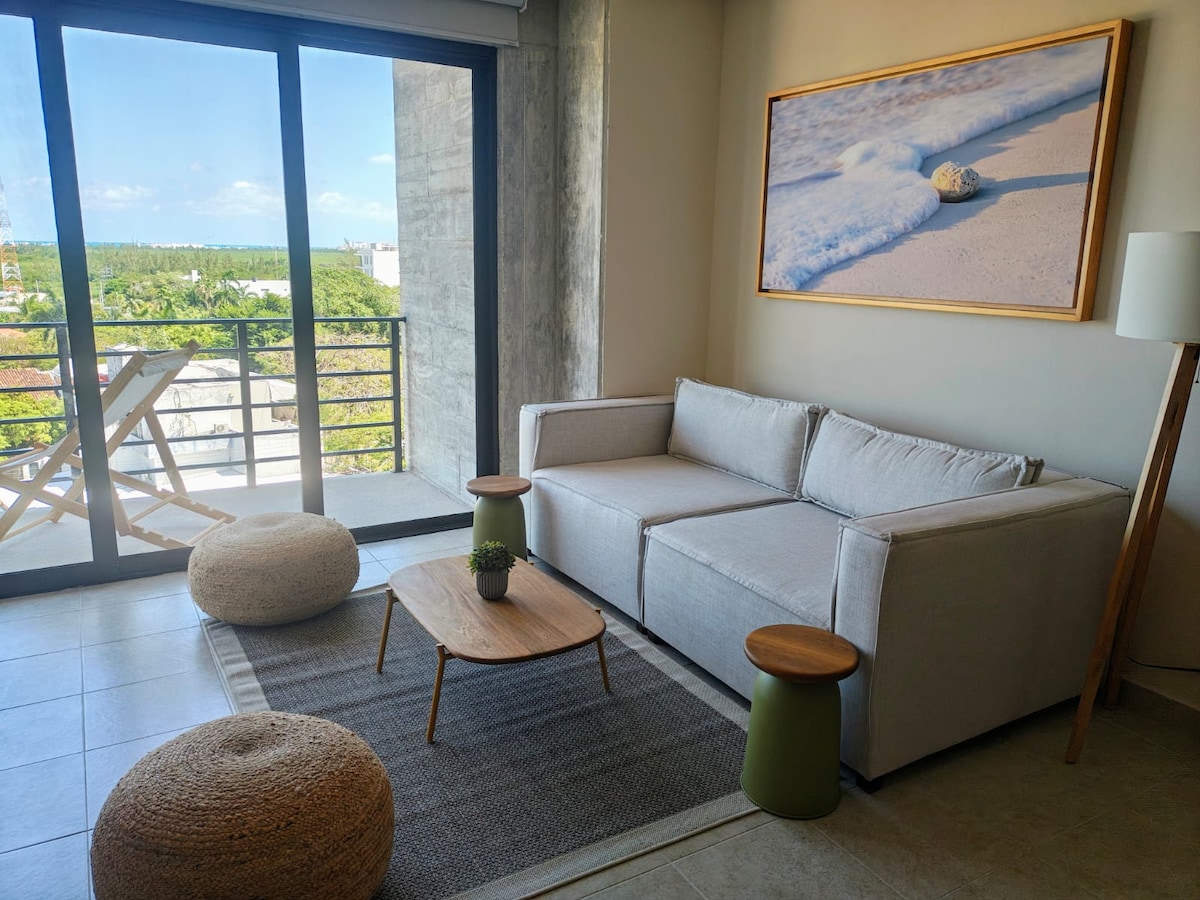 Un departamento con todo a unos pasos. El departamento cuenta con Sala-Comedor, cocina equipada con estufa eléctrica, un baño y un cuarto con una cama King Size con terraza . Variedad de opciones gastronómicas: Restaurantes y bares Supermercado y tiendas de conveniencias Centros comerciales Bancos y casas de cambio. Ofrecemos a nuestros huéspedes un desayuno continental, que ya está incluido en el precio.