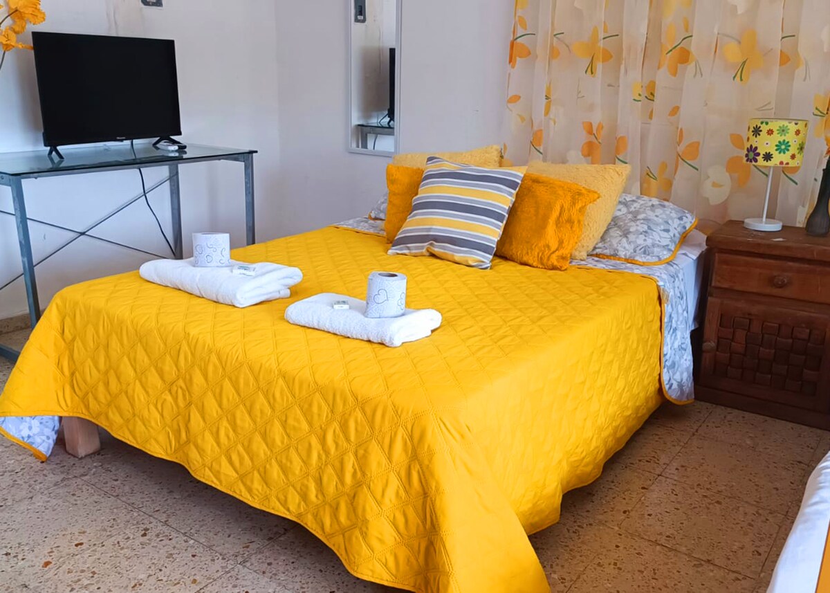 Un espacio nuevo, luminoso y acogedor. Amplia habitación c/techo de doble altura, cortinas blackout, aire acondicionado, TV e iluminación cálida por la noche o tan iluminada (blanca) como lo requieras. Una cómoda sala de estar con TV y cocina equipada con estufa y horno de gas y WiFi de alta velocidad; todo lo necesario para una estancia cómoda. Para recibirte, dejamos agua potable a tu llegada: dos botellas frías en el refrigerador y un garrafón de 20 litros con suficiente agua.