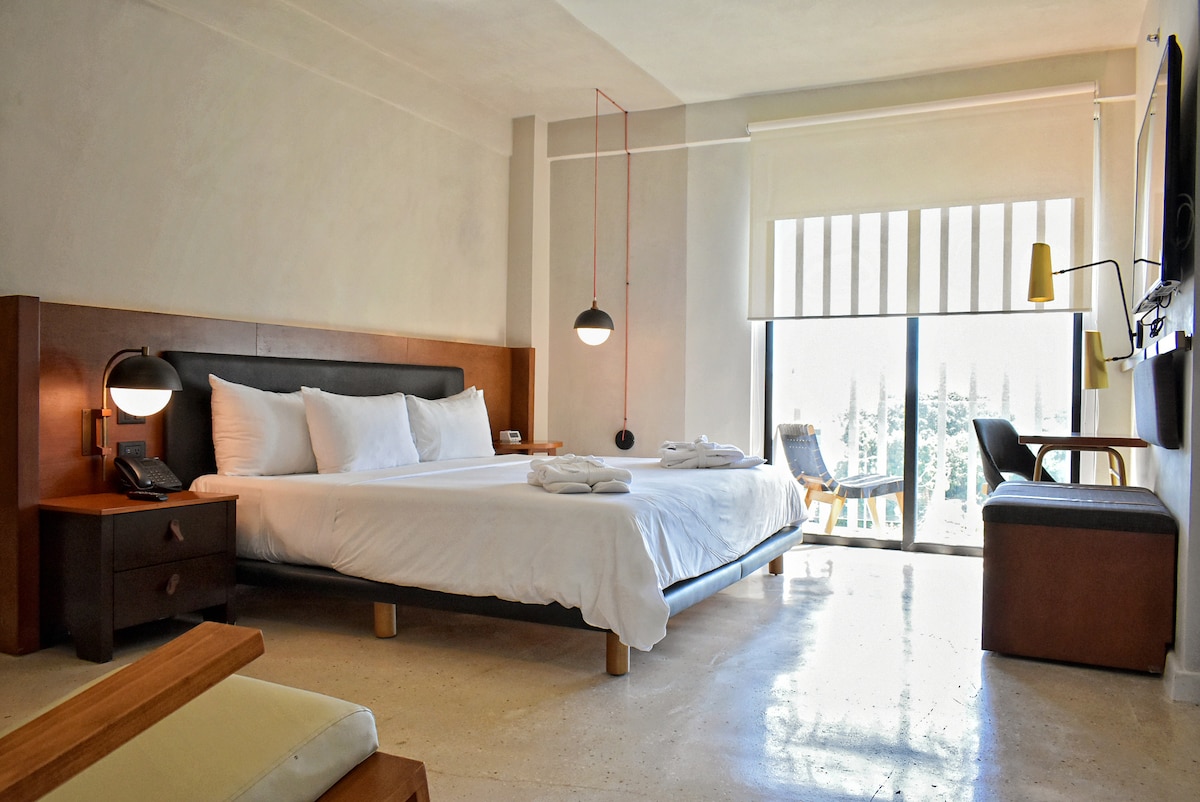 ⭐️¡ LA MEJOR☀️UBICACIÓN Y DESCANSO ! ⭐️ A tan solo 11 minutos de la playa y solo 8 minutos del centro. Estarás reservando nuestra Suite Deluxe, una habitación amplia y elegante diseñada para tu descanso. Reserva sin preocupaciones, ¡Cancelación gratis hasta 1 día antes! 🛏️ Cama King Size para un gran descanso ❄️A/C y WiFi de alta velocidad 📺 Smart TV de 42” con cable y apps de streaming 🌿 Terraza privada para disfrutar tus momentos al aire libre. 🔒 Caja fuerte y frigobar en tu hab