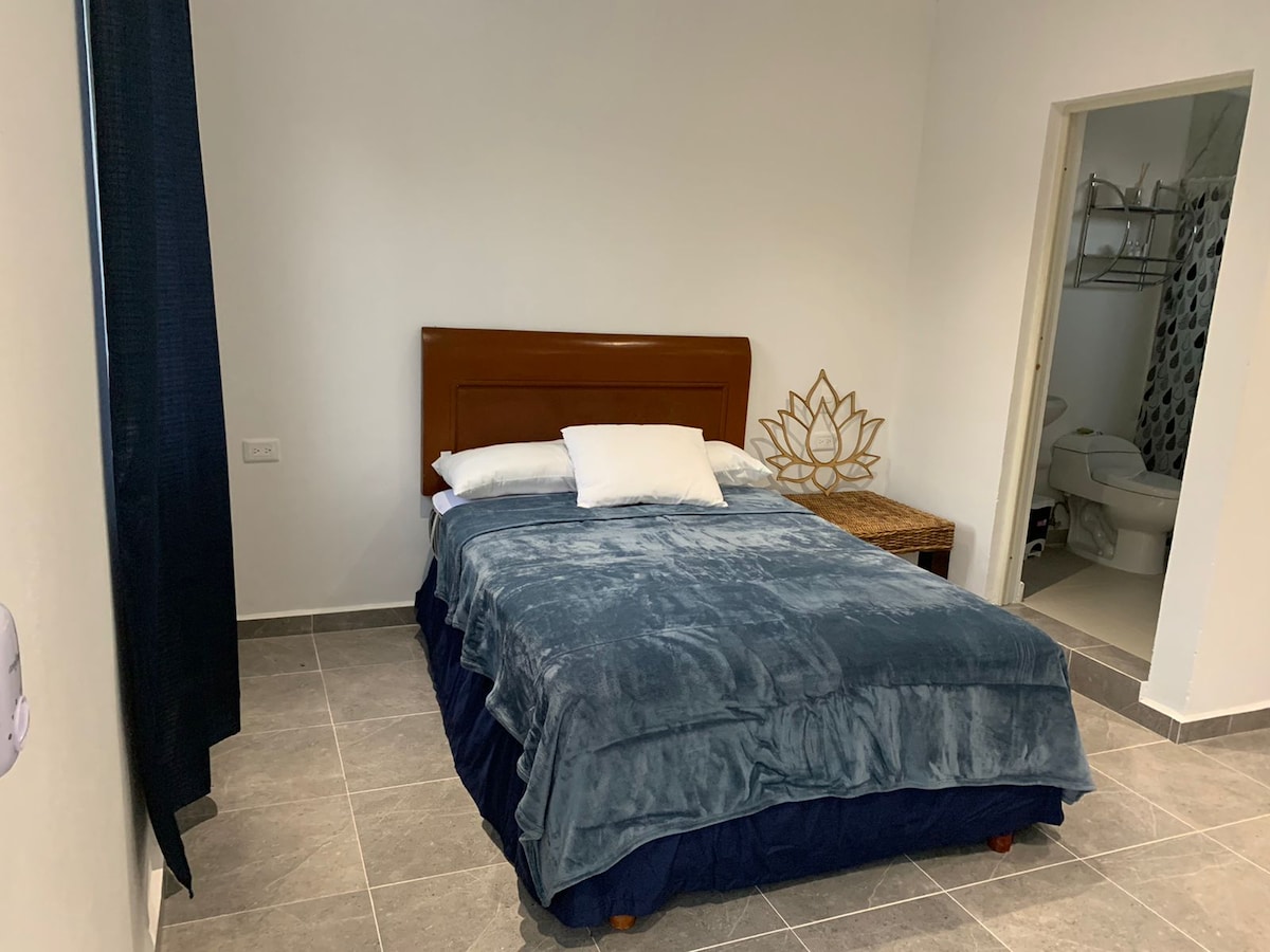 Maravilloso estudio para una o dos personas(no niños) en una zona céntrica y tranquila de Cancun. Cómodo, luminoso y muy bonito(nuevo). Tiene todo lo esencial para tu estancia en Cancun: TV con cable y Netflix, Aire Acondicionado, Wifi, Cocineta con refrigerador, alberca, top roof y mas amenidades. A pocos minutos caminando hay plaza comercial, restaurante, tiendas y transporte publico a dos calles para la ir a la zona hotelera y playas publicas. Todo lo necesario para sentirse como en casa.