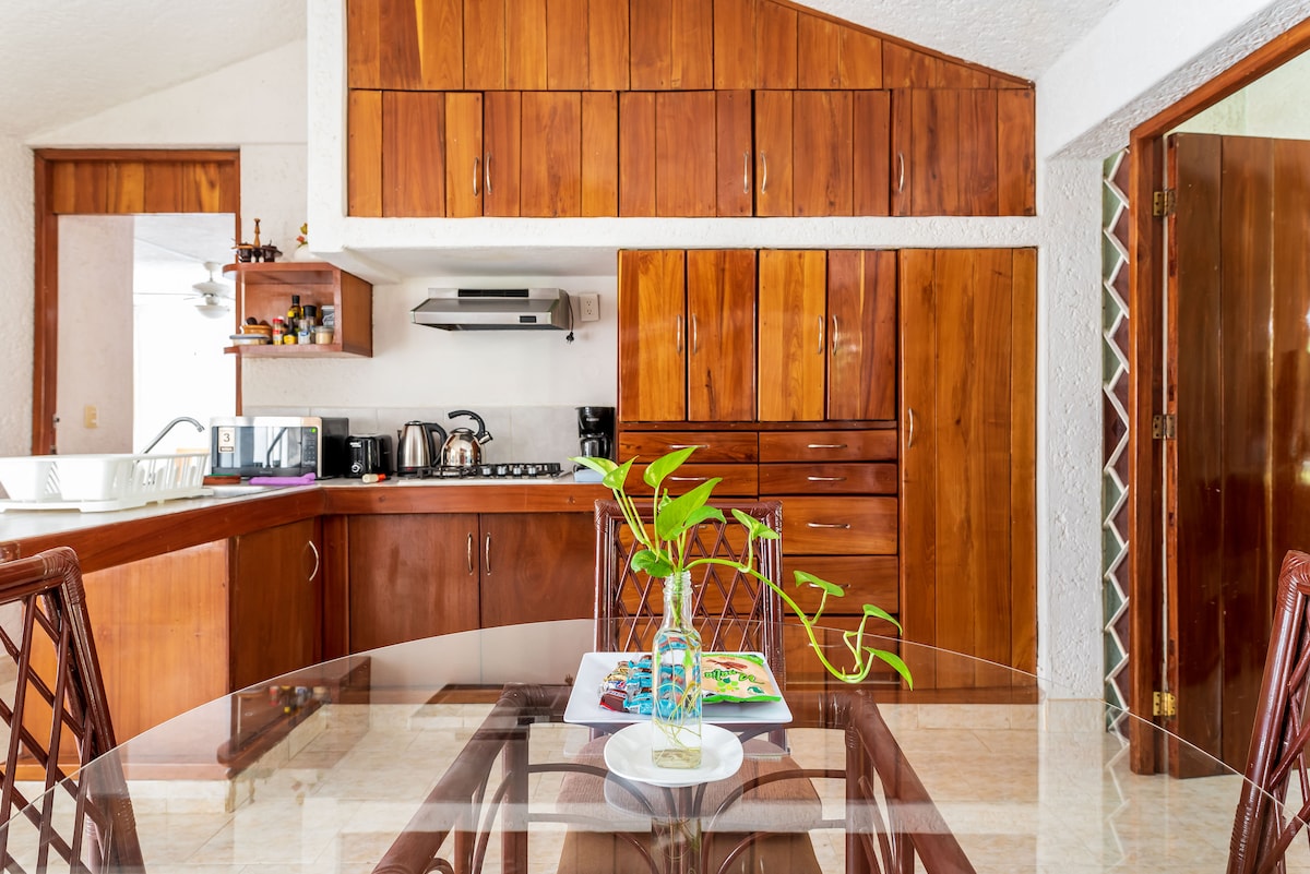 You will feel full of life in this suite with a terrace in a beautiful and peaceful park, 2.7 km from Playa Las Perlas (8 minutes by car, 13 by bike and 33 on foot). With fast WiFi, TV and A/C throughout the suite, super-equipped for long and short stays. Ideal for families or groups of up to 7pp: 2 bedrooms, 2 bathrooms and 1 covered parking. On the corner, 1 minute away, there is transportation to the beach, banks, restaurants, bars, shopping centers, super markets, handicrafts, and more.