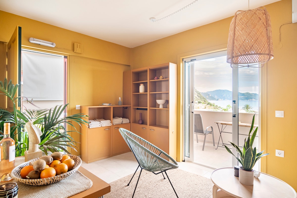 Enjoy this summer retreat located at the cliffside of Kalami Bay. The stunning bay view will make for the ideal place for you to unwind and relax while the sun and the crystal clear water of the Ionian Sea will set the tone for your vacation to be a memorable one. This cozy apartment has a queen size bed, private bathroom and a kitchen and of course a private balcony with stunning sea view. The beach and the village is a 5 minute walk away.