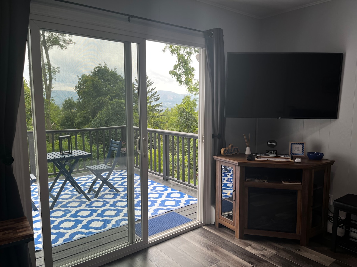 Cozy suite with fireplace and private deck views of the majestic Hudson River nestled in a quiet safe residential well-maintained neighborhood away from the city of Newburgh close to the Newburgh-Beacon bridge and the prestigious Powelton Country Club. This suite has a full kitchenette and a separate living space with couch, smart TV, queen bed and table. It has its own deck accessible by a sliding glass door where you can enjoy sunrises and soak in the peaceful views.