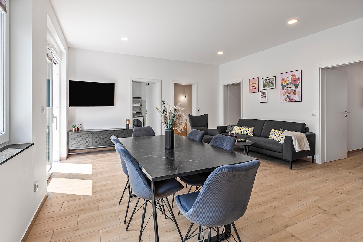 Unsere wunderschöne, neu renovierte Ferienwohnung bietet Platz für bis zu drei Personen. Das wunderschöne Wohn- und Esszimmer lädt zum Entspannen ein. Ein großer TV und die stilvolle Einrichtung ermöglichen einen unvergesslichen Aufenthalt. In der Küche findest Du alles Nötige wie Gewürze, Toaster, Wasserkocher, Herd, Backofen, Kühlschrank, usw. Die Wohnung liegt im dritten Stock unserer Ferienanlage. Im Freien findest Du einen sehr großen, eingewachsenen Garten zum entspannen.
