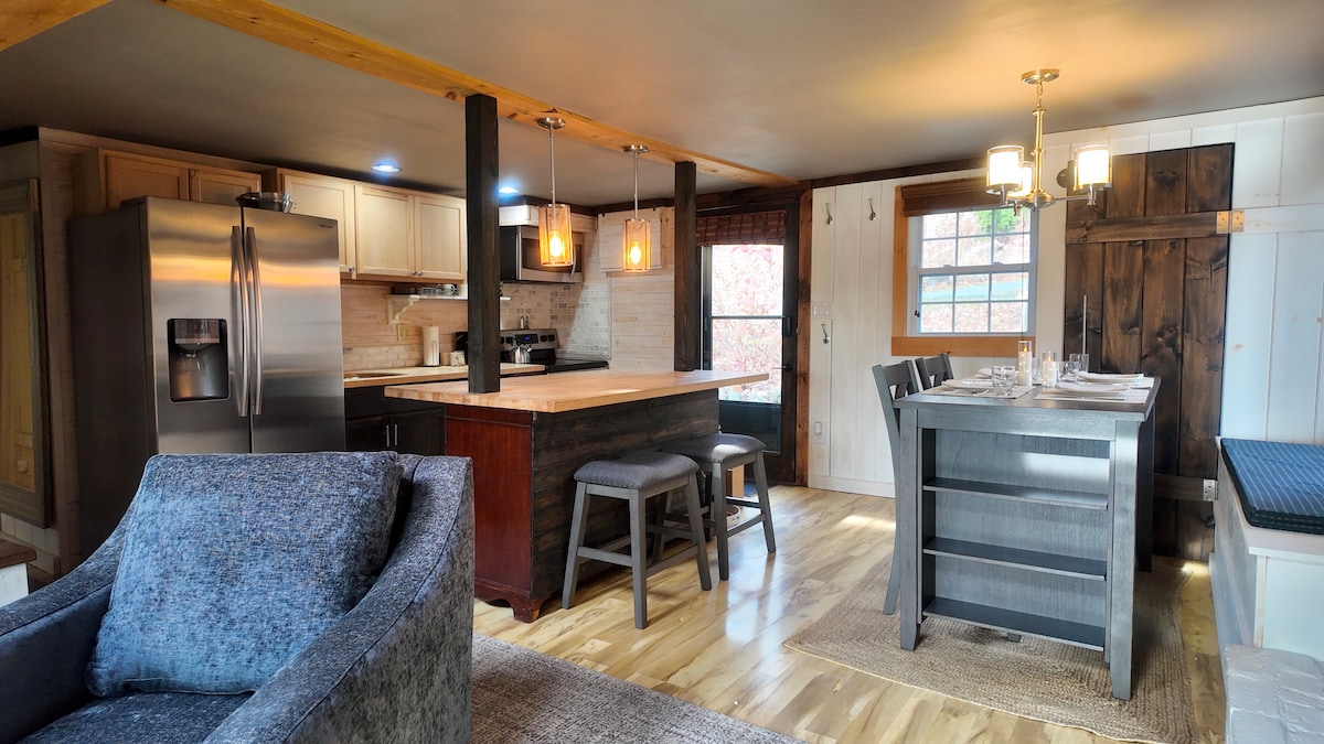 Kick back and relax in this calm, stylish space. A quiet getaway tucked away in the woods, sits next to a brook so there is always the sounds of water and peepers at night. Property sits on close to 4 acres of woodland, beautiful stone walls and is a short 20 minute drive to ski, hike, or a lake, making it perfect no matter the season! NOTE: there is ONE step from kitchen area up to living and ONE into the shower. Private entrance to a cozy in the woods hide away. Perfect for remote work!