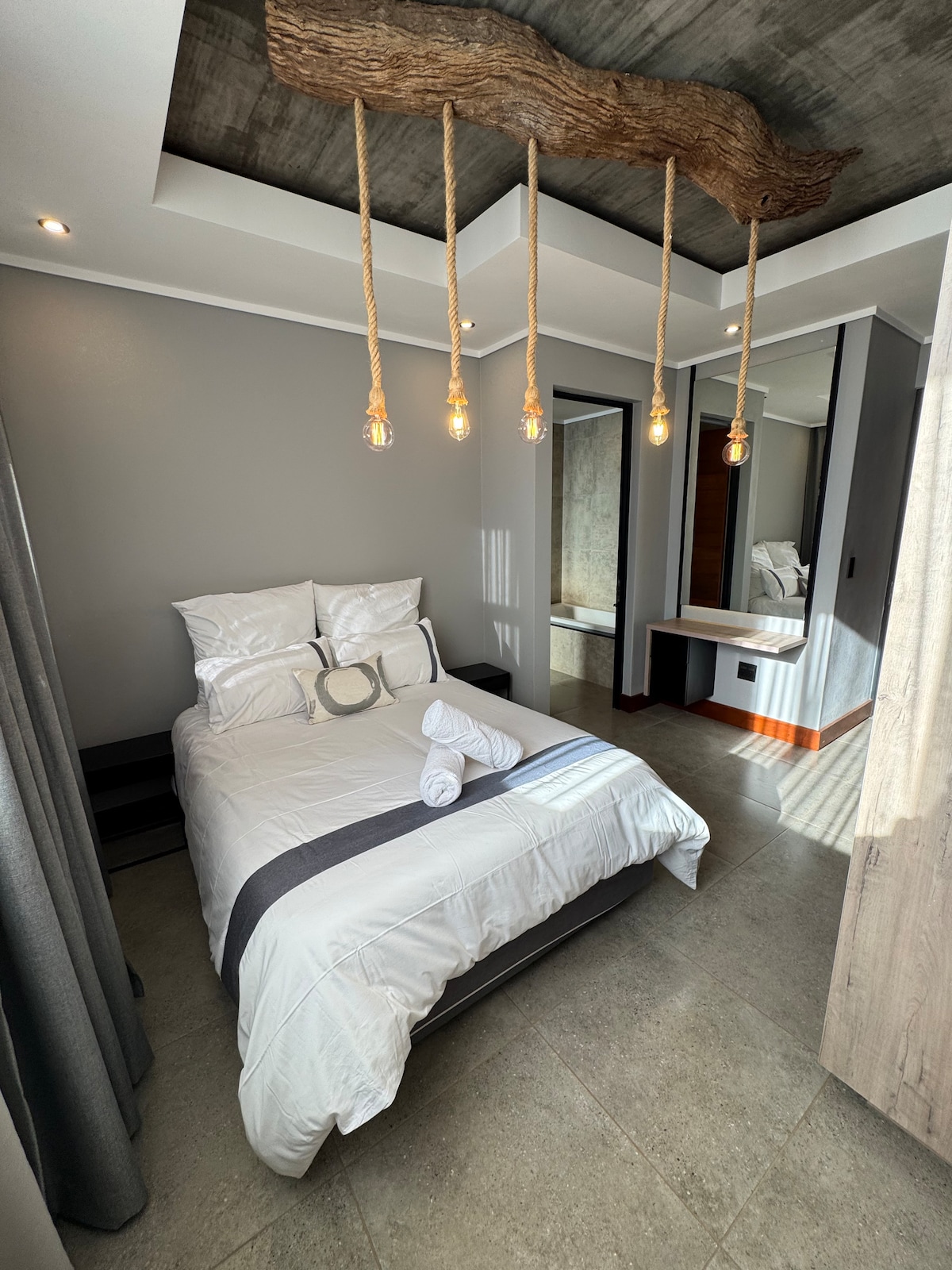 A modern industrial escape in the heart of Benoni. This stylish 2-bedroom, 2-bathroom apartment blends concrete ceilings, warm wood finishes and matte black details to create a space that feels curated yet comfortable. Enjoy open-plan living, a sleek kitchen with island seating, and a private balcony with a built-in braai — perfect for relaxed evenings in. Ideal for business travellers, couples, or small families looking for a secure, design-forward stay.