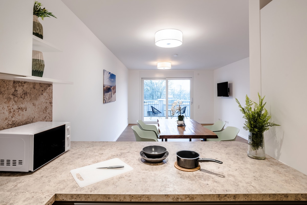 Geräumige Wohnung mit 4 Schlafzimmern für bis zu 6 Gäste. Die Wohnung verfügt über eine voll ausgestattete Einbauküche, ein modernes Badezimmer mit Dusche, einem Essbereich und einem Smart-TV. Zudem verfügt die Wohnung über einen großen Balkon mit schönem/freiem Blick ins Grüne.