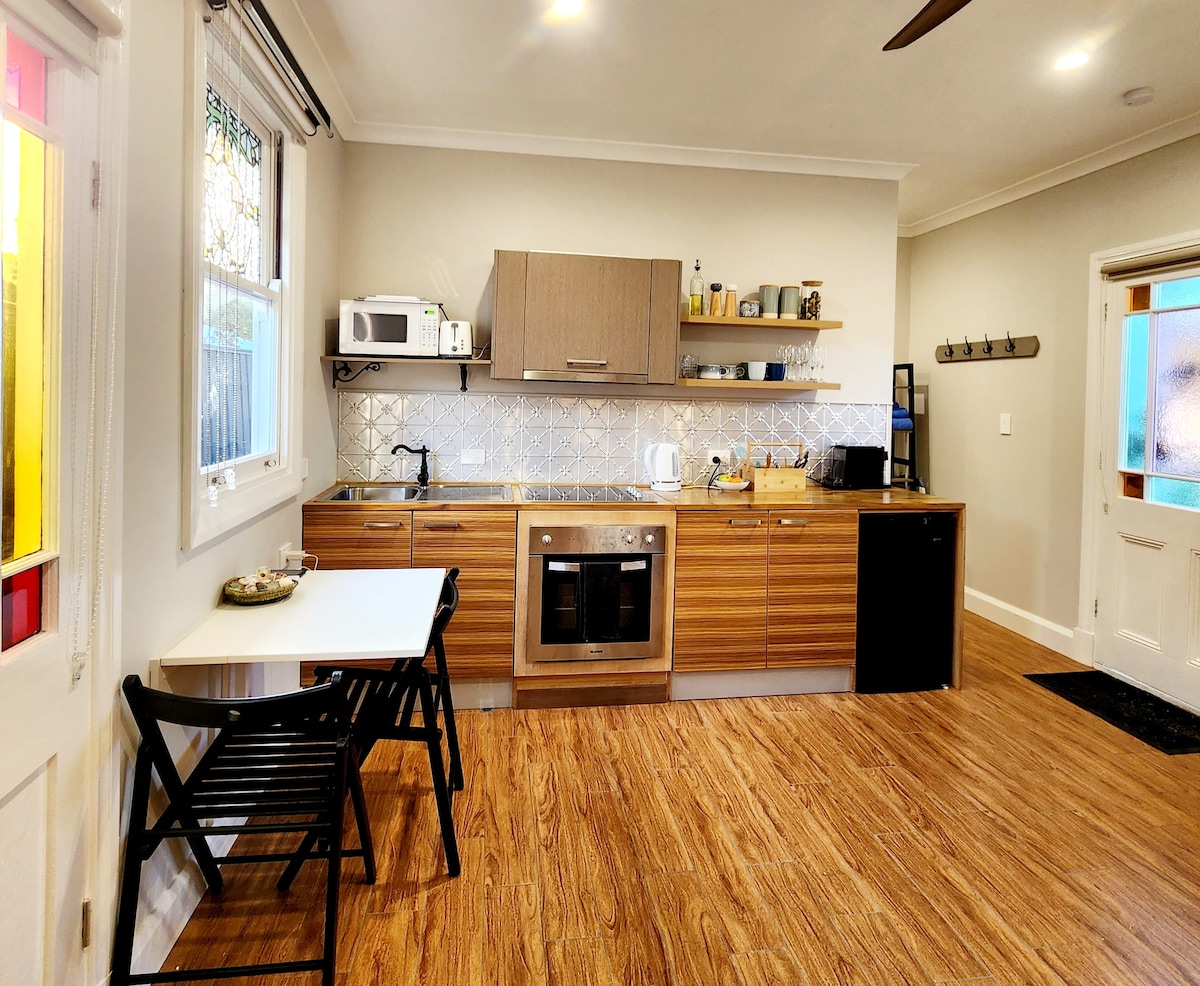 The self contained studio is fresh and bright with a well appointed kitchen with microwave, gas cooktop and mini oven. Basic breakfast is supplied .The bathroom is compact with shower, heated towel rail & hairdryer.The studio has reverse cycle AC, internet, smart TV with Netflix. It is separate from the house and your privacy is ensured as a 1.8m fence divides the two. There is your own sitting area in front of the studio with BBQ.