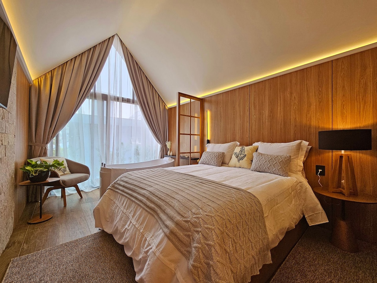 Localizada dentro da cidade, a apenas 1000 metros do centro, a cabana Malbec tem um visual interno que mescla o contemporâneo com a rusticidade do rural, o revestimento em pedra na parede transmite um toque de casa antiga da vovó e os painéis de madeira, aquecem o ambiente num visual mais intimista. Na banheira de imersão, respire fundo e permita que a água morna acalme sua mente e tire a tensão do seu corpo, transportando-o para um estado de total relaxamento. *Café Manhã Opcional.
