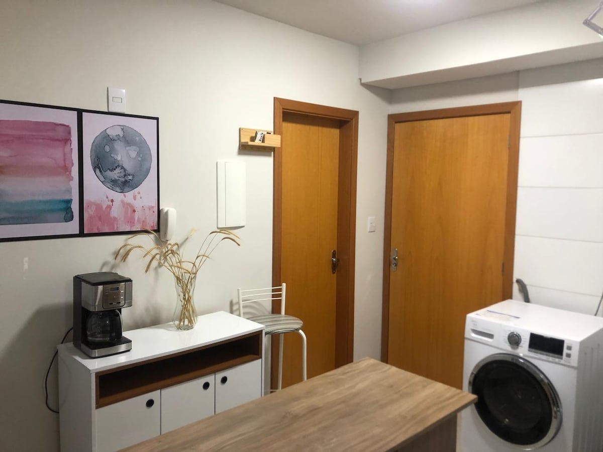 Apartamento novo 1 quarto com cama casal e colchão queen size,TV Smart 32",split de 9.000 Btu's, guarda roupas e bancada para anotações. Cozinha com cooktop,forno de embutir,micro ondas, geladeira e churrasqueira rotativa. Área de serviço com máquina lava/seca. Sala estar com TV Smart 48" e sofá cama para 2 pessoas. Aquecimento a gás no chuveiro,cozinha e lavabo. Split 12.000 Btu's no ambiente que abrange cozinha, sala de estar e jantar. Próximo aos pontos turísticos Aurora e Maria Fumaça.Wi-Fi.