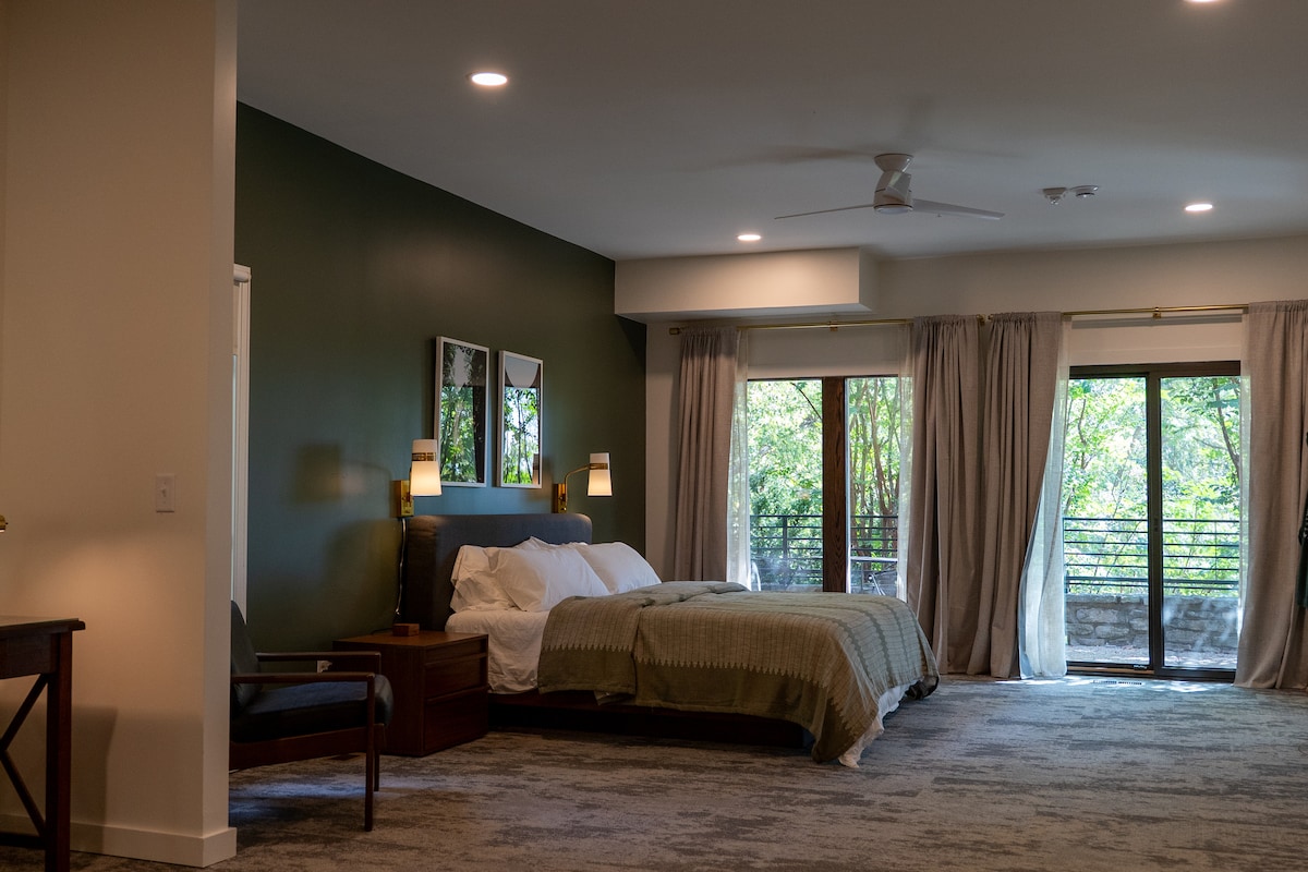 Enjoy quiet seclusion and patio views from this ground level king suite, one of our largest rooms, allowing your party to spread out . Room features include: -One (1) King bed -One (1) queen sleeper bed -Large attached ensuite bathroom with double vanity -Desk setup & additional lounge furniture