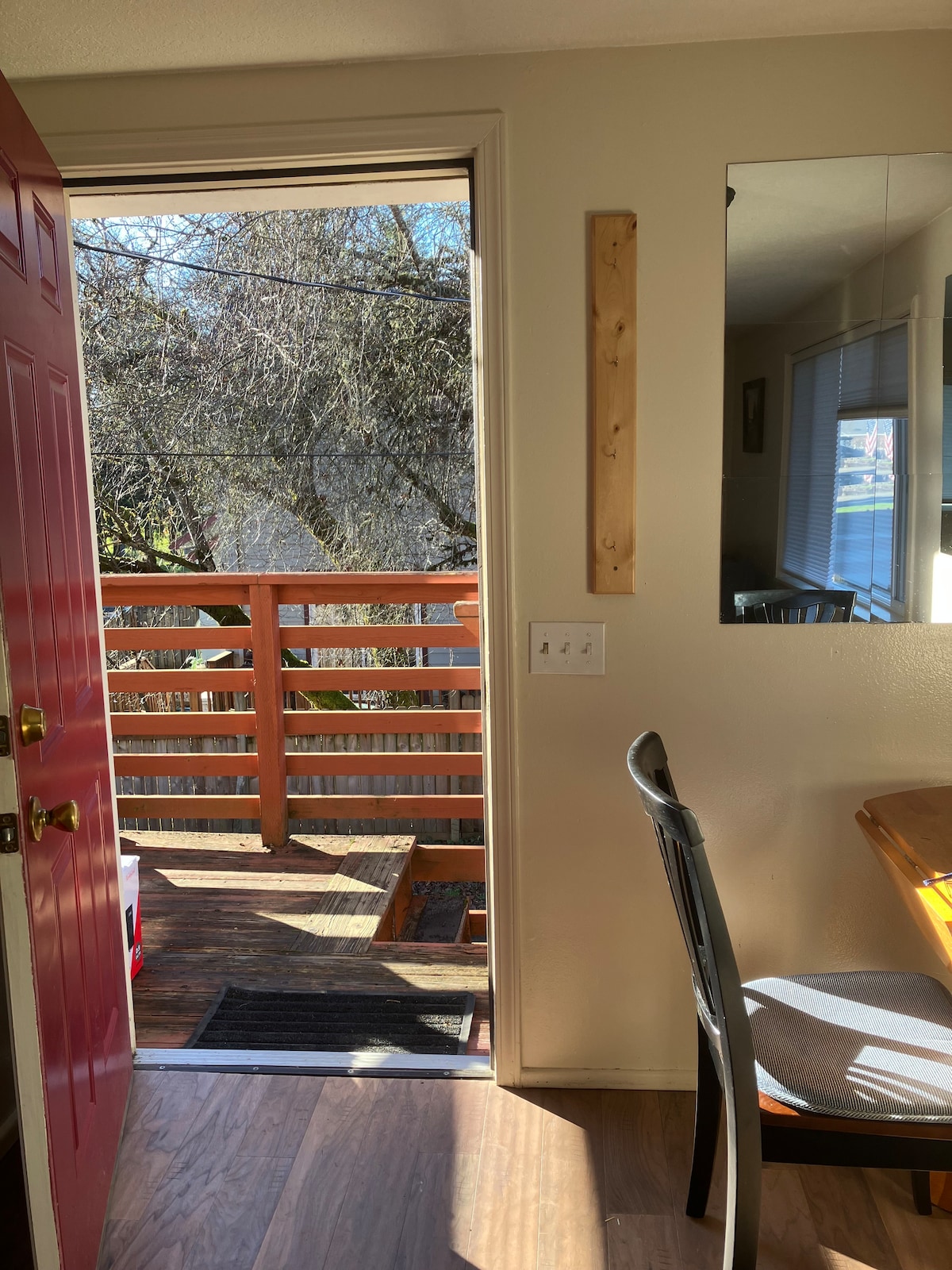 Our nicely appointed “hideout” is fully self-contained. A covered walk and staircase lead up to your private deck. Enter into the quiet living area; rest peacefully in the bedroom with privacy of a door. Gaze out picture windows, watch 60” TV, fold out the king-size sofa with Temperpedic mattress for friends or kids. Cook in the complete kitchen. The bathroom has heated tiles and a low-threshold shower. Walk greenspace, neighborhood trails. Stores, services and OSU campus are just minutes away.