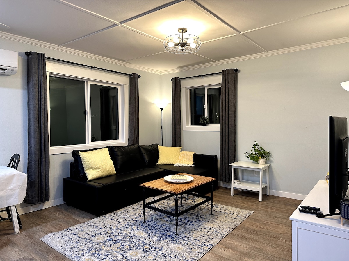 This quiet attached room is located on a dead end street close to OSU. The gas fireplace gives this large, one room, one bathroom space a cozy feel. The separate entrance and free parking add to the privacy and convenience. The many windows face a large private backyard that has a park like feel. The patio and attached yard is only available for use by guests through prior arrangements with owner. The oversized couch is big enough for two to sleep on.