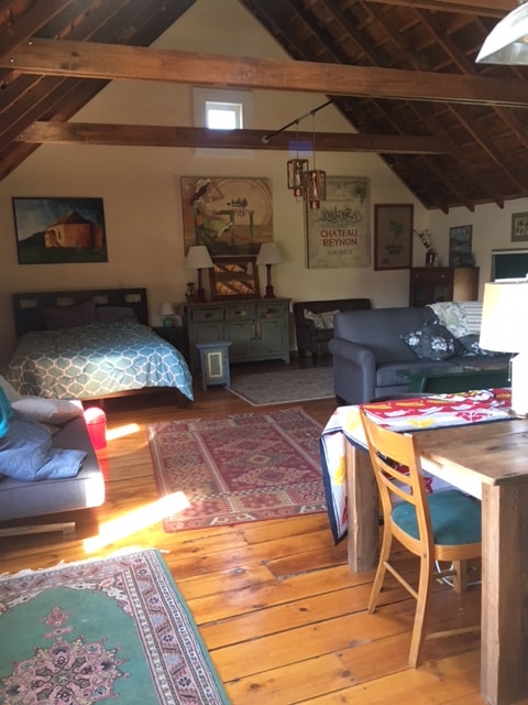 Sweet cottage on our farm: Fully equipped kitchen and furnished living/sleeping area 14’x15' approx., washer/dryer. Sleeps 4: queen bed and queen sofa bed. Lots of privacy and next to organic garden, fields, stable and fruit orchards. All utilities, TV and WI-FI included. Well water with new water softener and water heater. Pet friendly; no pet fee. Lots of farm paths to walk your pet. Encourage off leash if trained. Horses have moved to another farm while pasture and stable rehabbed.