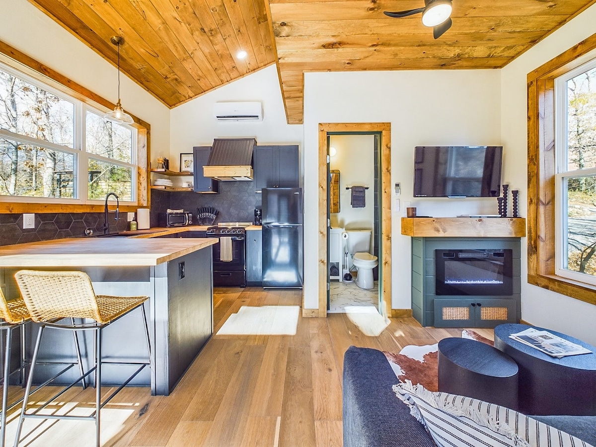Welcome to Pedal and Perch, a custom-designed and built accessory dwelling cabin just minutes from downtown Bentonville, AR, Walmart HQ, and miles of incredible mountain biking. Enjoy a serene setting that tucks you among the trees and makes you feel like you are staying in your own treehouse. The cabin features a custom kitchen, one bathroom, a queen bed in the loft, a pullout sofa on the primary floor, and your very own outdoor bathtub looking in to the valley below.