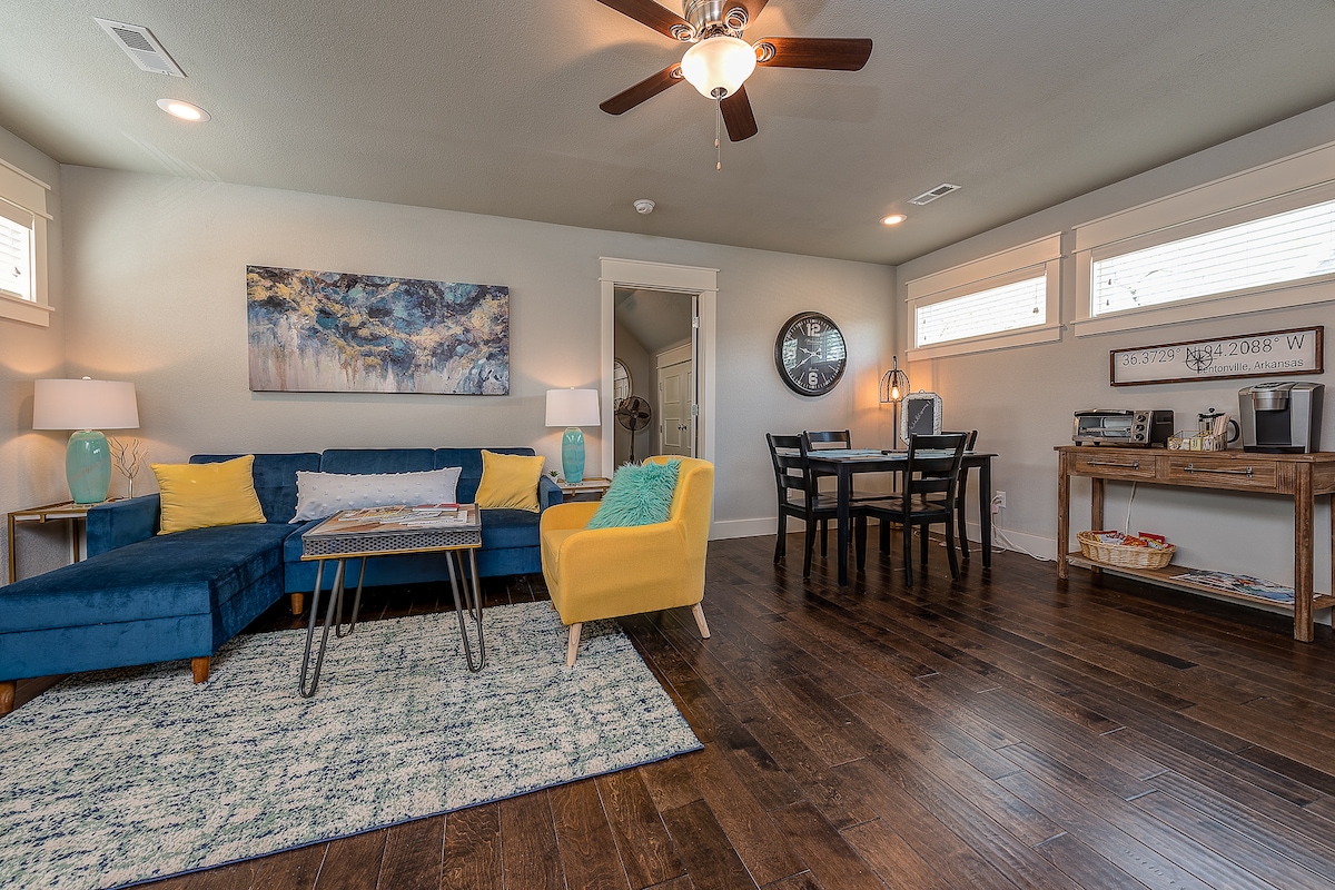 Keep it simple at this peaceful and centrally-located guesthouse. 10 minutes from Downtown Bentonville, with easy access to Hwy 49, Sam’s Club, NWACC and all that NWA has to offer! This one bedroom includes a queen bed, with pack-n-play, a queen futon bed and small futon in the living room which allows 4 adults and 1 child to sleep comfortably. The partial kitchen has an electric burner, microwave, coffee pot, and a small combination oven/air fryer/toaster. Check us out! We think you’ll love it!