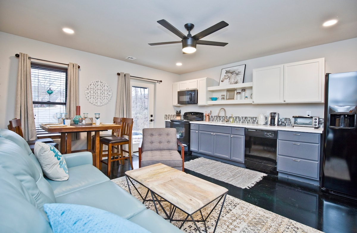 Come experience Bentonville's small-town charm at Tabor Cottage, our 750 sqft guest home. Enjoy the open floor plan, full kitchen with island, cozy living area, spacious king-size bedroom, washer/dryer, and 1.5 baths. Your clean, private retreat awaits, and we're here to assist with anything you need during your stay. We are near bike trails, world class Crystal Bridges museum and amazing restaurants- all within walking distance. Come enjoy the urban life at Tabor Cottage.