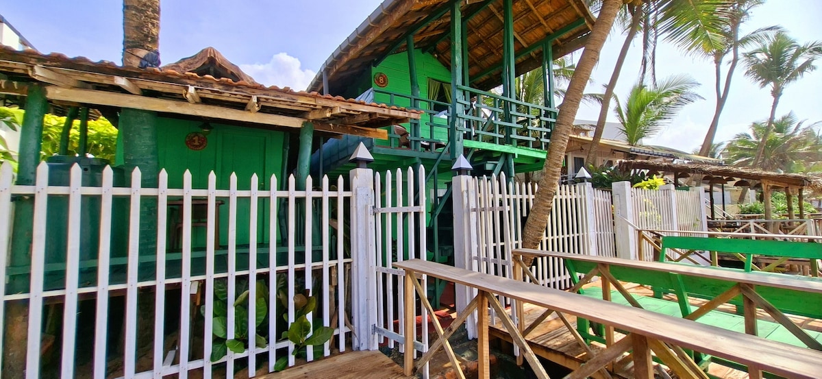 Beachfront cabana at Luna Beach Home & Cabanas in Boossa, Galle, with private balcony and stunning sea view. Relax in a comfortable double bed, fan, and fresh linens. Shared bathroom is clean and stocked. Steps from the beach with chairs, sunbeds, and ocean breeze. Perfect for couples, solo travelers, or small families seeking a peaceful, back-to-nature escape.