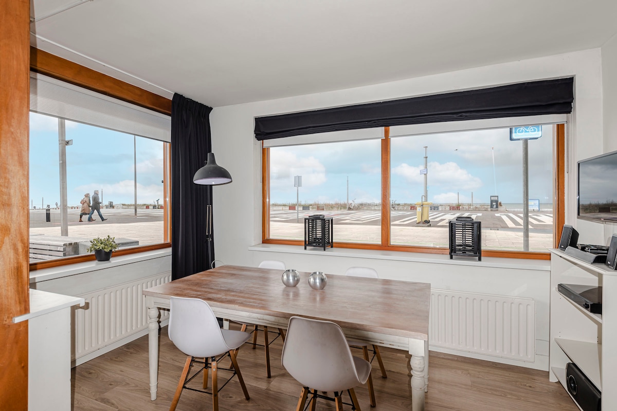 The apt. (40m2) is located right in front of the beach and next to the dunes. From your appartment you have a breathtaking view over the sea. It will comfortably fits 2 and is completely new, finished in June 2021. Cozy living room with TV, fully equipped kitchen, comfortable king size bed, perfect WIFI and nice bathroom. You have a private parking spot right next to the apt, as well as a private terrace with dining table and comfy beach chairs. Your dog is very welcome, we allow only 1 dog.