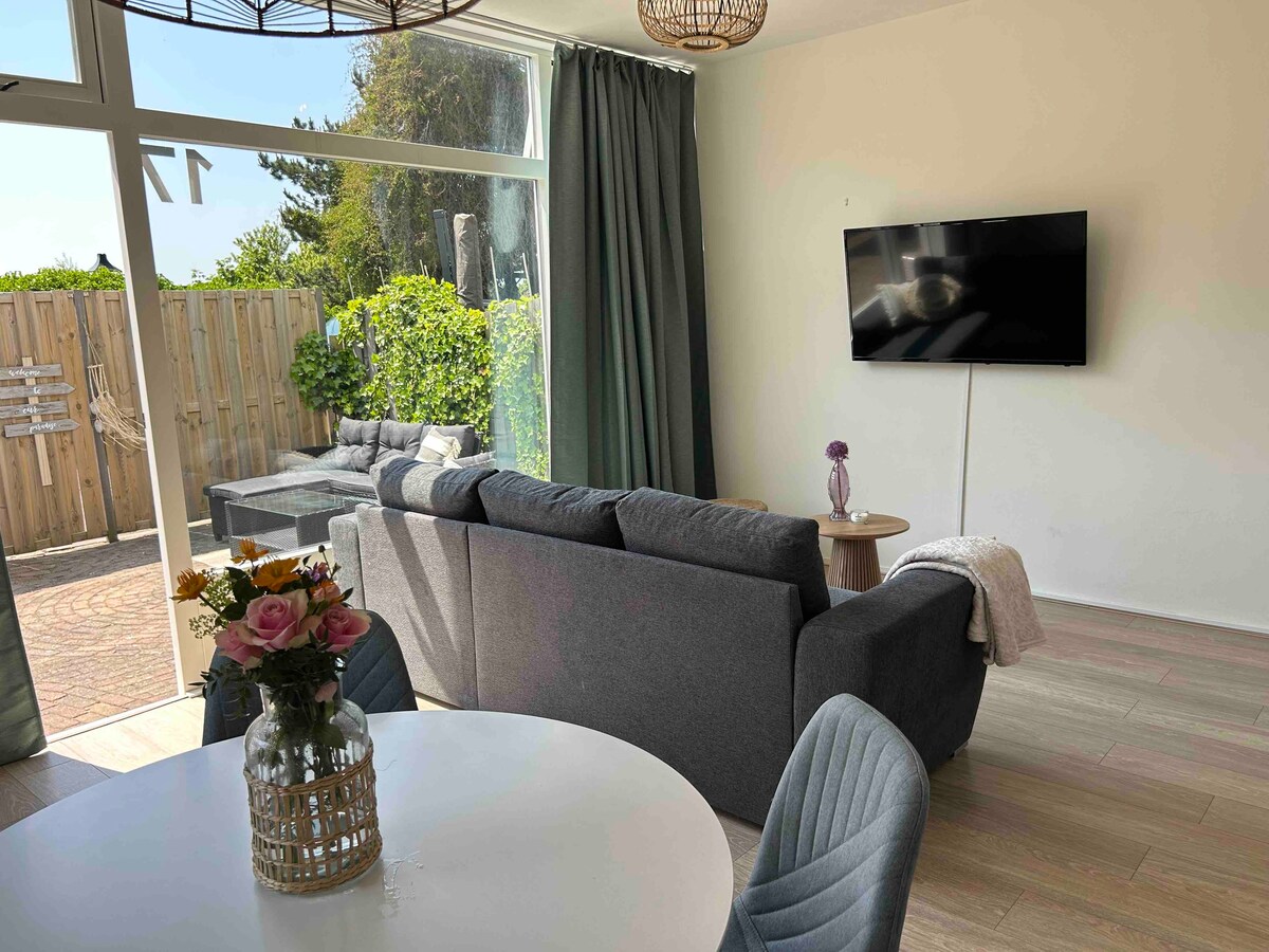 Our sunny garden chalet is freely situated in our 400 spuare metre-large garden behind the house. The chalet has sliding doors to the garden, a pull out sofa bed (double), an open kitchen, underfloor heating and a wood stove. Enjoy the peace on your own sunny terrace among the flowers and plants! Located in the heart of the flower bulb area near the coast, within 7 minutes walking distance to the train station.