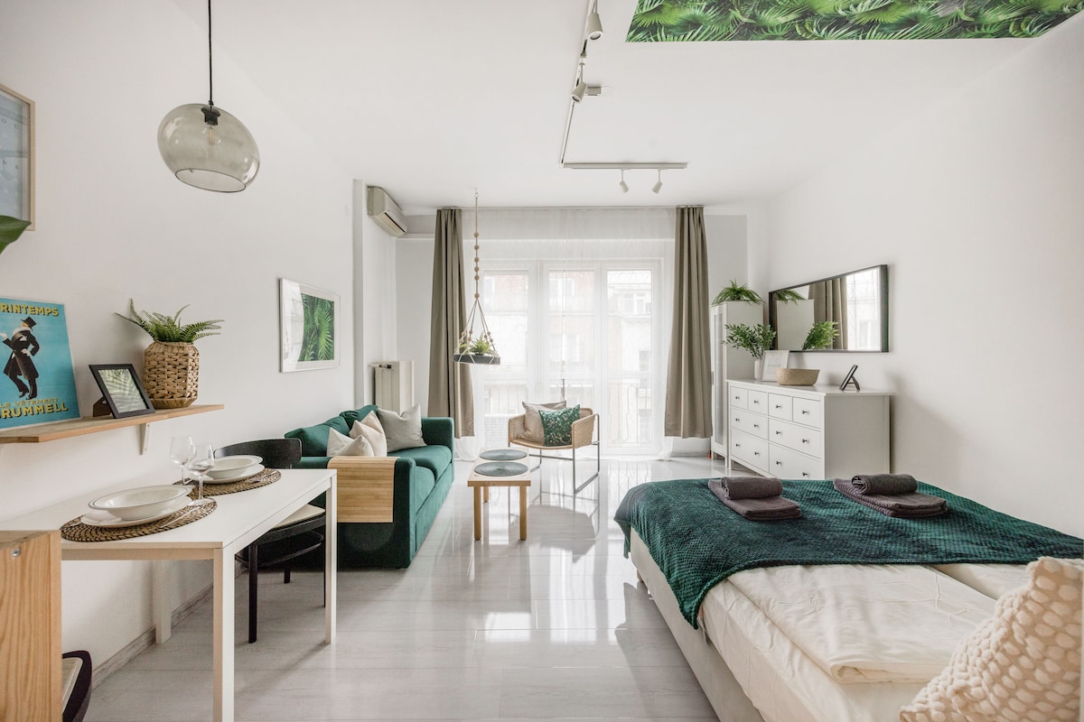 My recently renovated studio apartment is situated in the heart of the city, amidst the lively nightlife, yet it provides a peaceful and sunlit atmosphere. It is conveniently located on the fifth floor of a contemporary building, overlooking a tranquil courtyard. The apartment includes a balcony, and the building is equipped with an elevator for easy access. The kitchen is well-equipped with a sink, cooktop, electric kettle, microwave oven, and a Nespresso machine for your convenience.