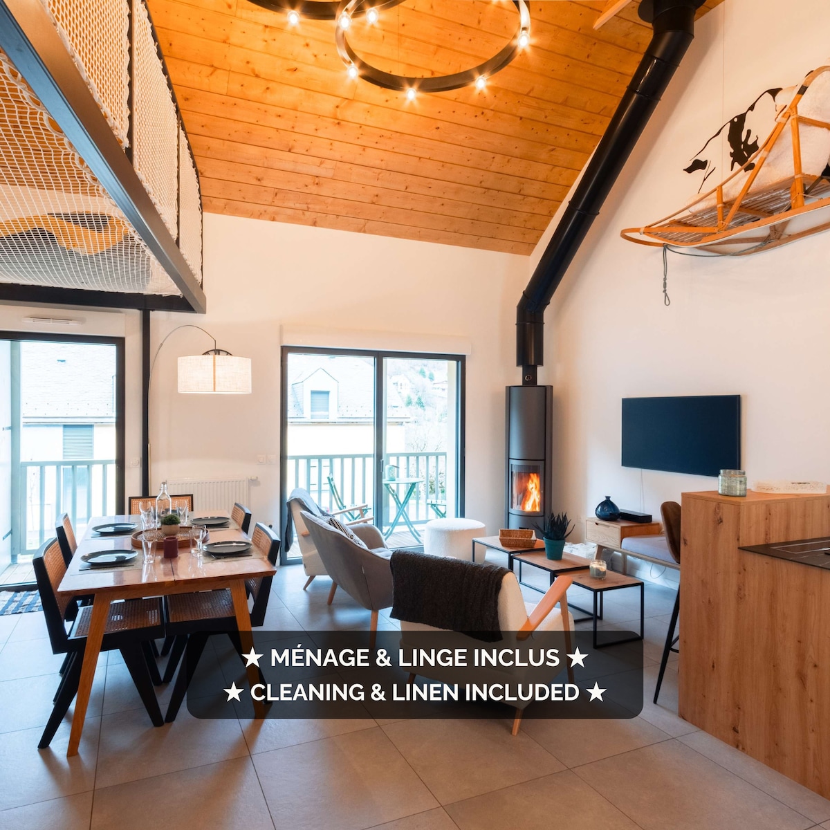 Chalet tout en bois, aux lignes sobres et contemporaines, alliant confort moderne et décoration chaleureuse avec vue imprenable sur les montagnes, dans un petit hameau de 5 chalets haut de gamme, placés dans un espace privilégié de notre petit camping, point de départ de multiples randonnées & activités. Une séance offerte à l'Espace Bien-être, espace bien distinct du chalet, avec SPA et SAUNA entièrement privatisé. Ne sont pas compris, le linge de lit et de toilette. Possibilité de location.