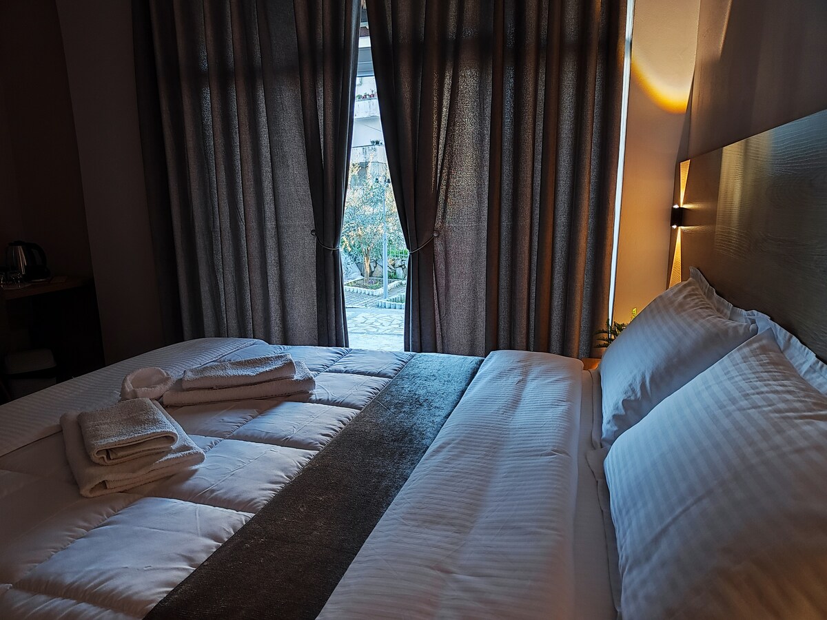 Welcome to our upscale Garden View Room - Eden! Perfect for couples, solo travelers, digital nomads, and influencers, it features a cozy and modern design with garden views, a dedicated workspace, free Wifi, Smart TV, and a chic bathroom. Relax in the plush queen-sized bed, and enjoy the serenity of our garden xoxo <3 Our property is located only a 5-minute walk from Berat's center and is positioned in a quiet neighborhood. You can park in front of the property or close by.