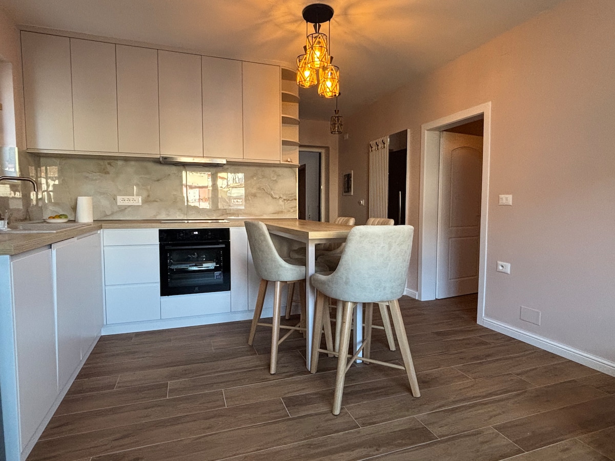 Welcome to your home away from home in Berat, Albania known as the “City of One Over One Windows”. This stylish, fully furnished apartment is located in a two-story villa near Deshmoret e Kombit Park and Gorica Bridge. It features a spacious living room with sofa bed, a modern bedroom with a queen bed, a fully equipped kitchen, private balcony, shared terrace with grill, and washing machine. Perfect for small groups, couples or families exploring historic Berat. We can’t wait to host you.