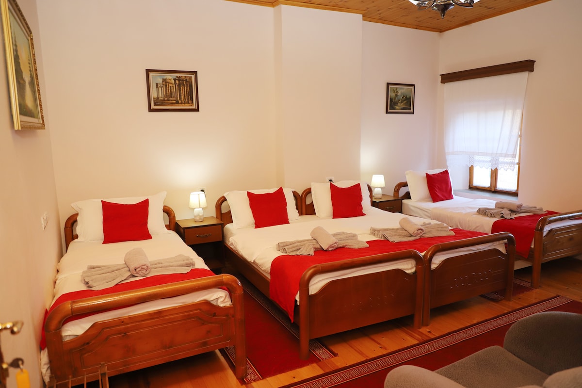 Relax with the whole family or friendgroup at our peaceful place.Our three-room guesthouse offers accomodation for travelers that need a place to stay.And what can be a better place other than a cozy villa near the centre of Berat from which you can see the beautiful castle and dinner outside for the starry nights.Also free parking is included.
