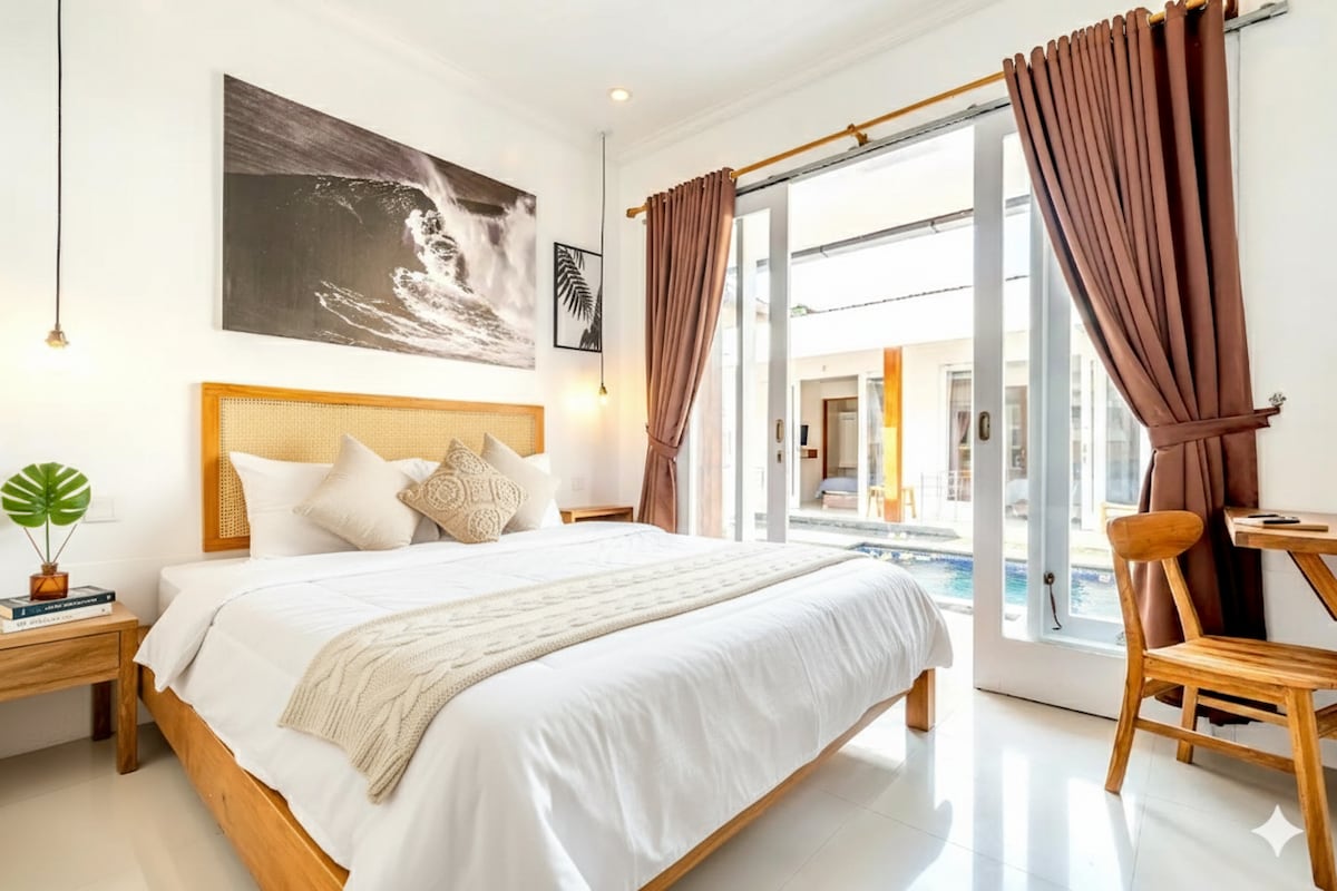 Experience the best of Bali at our guesthouse, located in the heart of Canggu. Just minutes away from surf-friendly beaches, our place is surrounded by trendy cafés, restaurants, supermarkets, beach clubs, gyms, yoga studios, spas, and boutiques. Our rooms are quite spacious, equipped with an ensuite bathroom and high-speed internet. Perfect for those who work remotely or are just stopping by in Canggu for a few days.