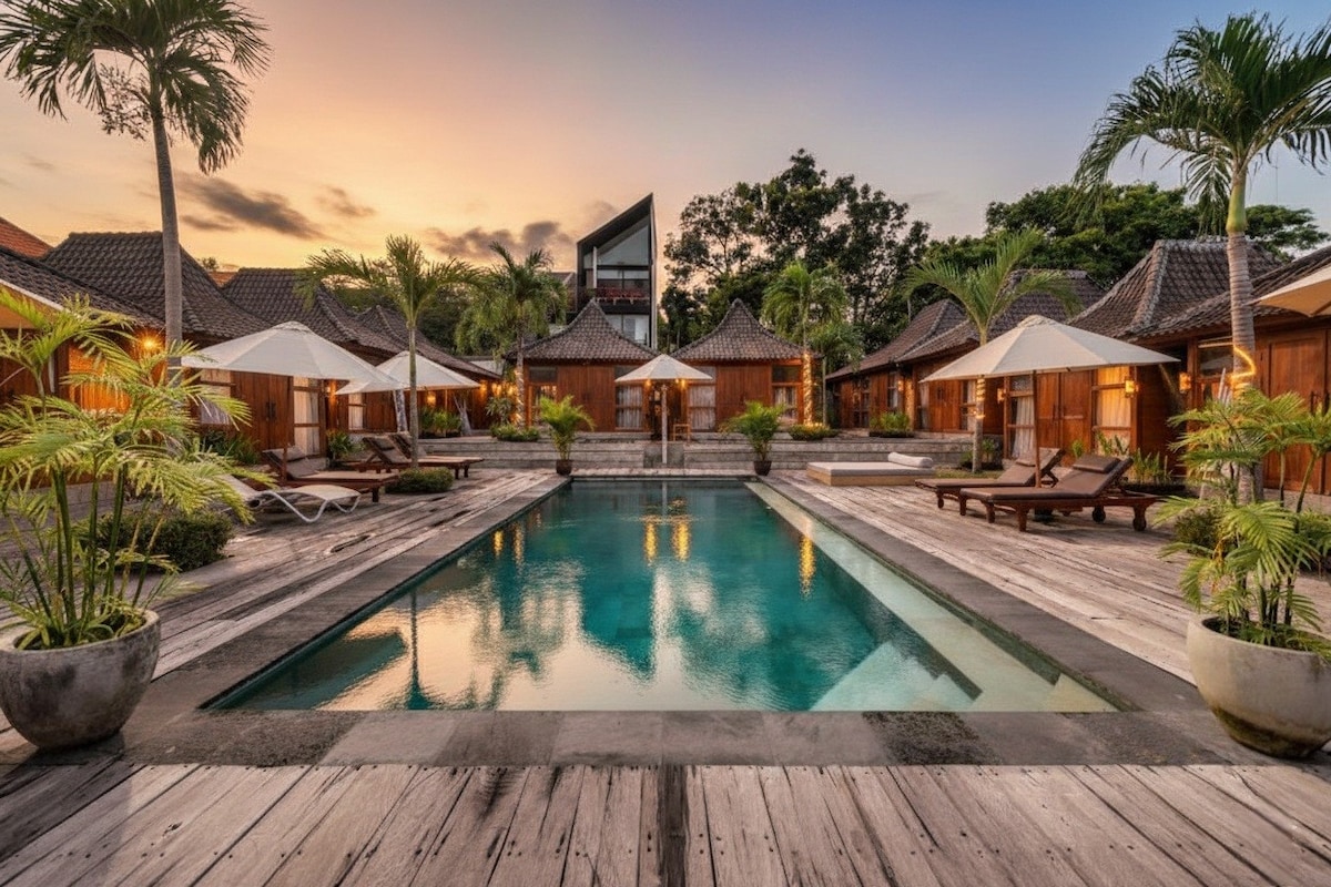 Discover a modern guesthouse in Pererenan with beautiful views of the surrounding rice fields. Our peaceful setting is ideal for relaxation. Enjoy meals by the pool or delivered to your room from our on-site restaurant. With reliable internet throughout the property, working remotely is effortless. Choose between our loft apartment with a kitchen or one of our comfortable rooms for a stay tailored to your needs.