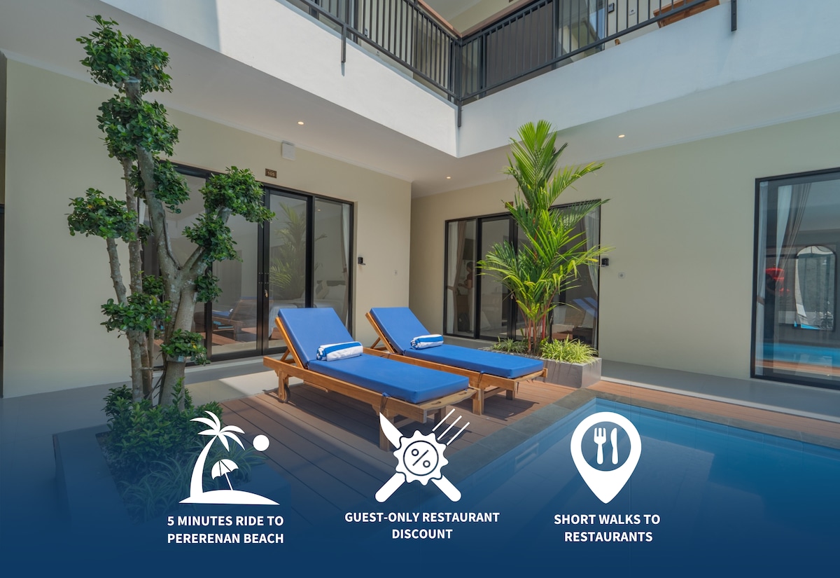 Discover a modern guesthouse in Pererenan with beautiful views of the surrounding rice fields. Our peaceful setting is ideal for relaxation. Enjoy meals by the pool or delivered to your room from our on-site restaurant. With reliable internet throughout the property, working remotely is effortless. Choose between our loft apartment with a kitchen or one of our comfortable rooms for a stay tailored to your needs.