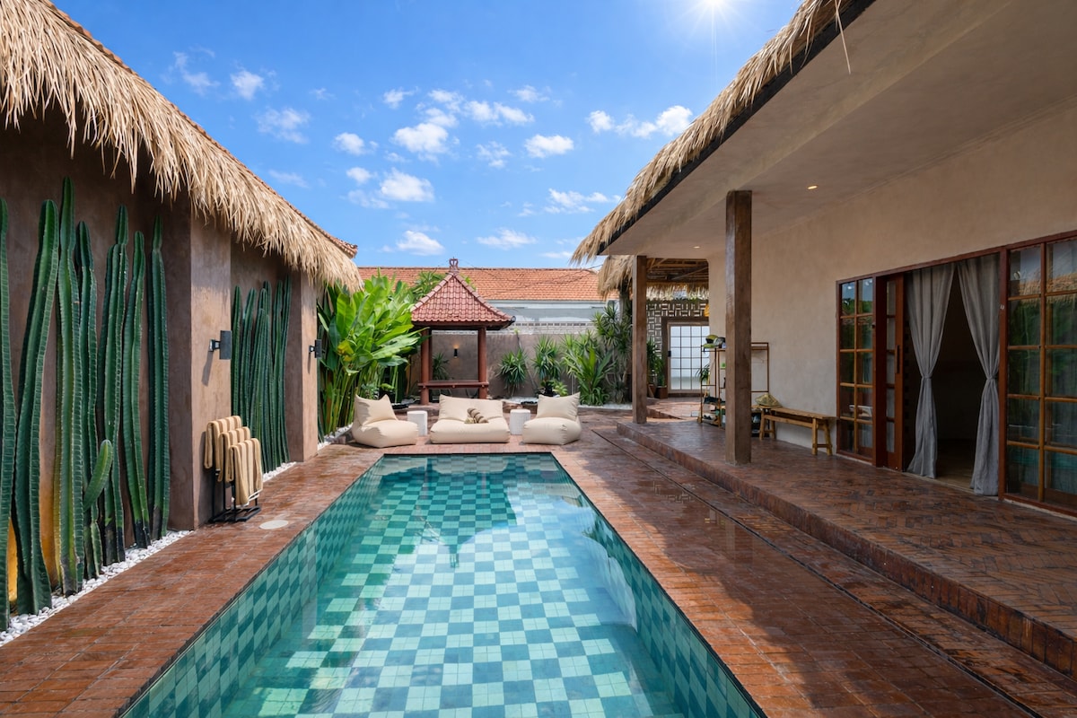 Welcome to our luxury villa in the heart of Canggu, just 500m from the beach and surrounded by 40+ cafés and restaurants within walking distance. Enjoy carefree days with your private pool, tropical garden and daily cleaning. ✔ Air conditioning in bedroom, living room & kitchen ✔ Private pool ✔ Daily cleaning ✔ Beach & bath towels included ✔ Fresh drinking water dispenser ✔ Skylight bathtub ✔ Tropical bedroom view ✔ Fully equipped kitchen ✔ Fast WiFi ✔ Smart TV