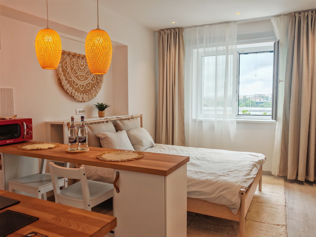 This modern and stylish studio apartment in Bucharest is perfect for a couple. It offers a cozy, spacious atmosphere with high-end furnishings and a smart layout. The kitchenette is well-equipped for light meals, and the bathroom is sleek and modern. Guests can also enjoy premium amenities, including a swimming pool and sauna, ideal for unwinding, for a fee of 100RON . This apartment provides the perfect blend of comfort, luxury, and convenience for a memorable stay in the heart of Bucharest.