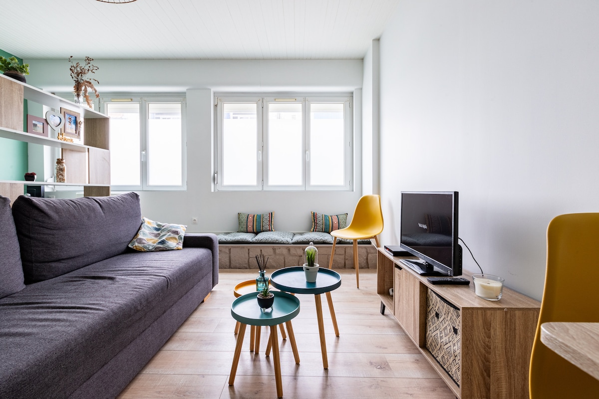 Joli appartement lumineux de 30 m2, situé dans une résidence au 2ème, refait à neuf (02/22), à la déco moderne. Belle pièce à vivre, cuisine équipée. Logement pour 2/4 Pers (1 Ch avec avec lit 140x200 + convertible pour 2 personnes dans la pièce à vivre). Idéalement situé à 400m des plages et à 5mn à pied du centre ville. Arrivée autonome possible (digicode et boîte à clés). Oreillers, couettes, protèges matelas fournis, linge de lit et de toilette non fournis.