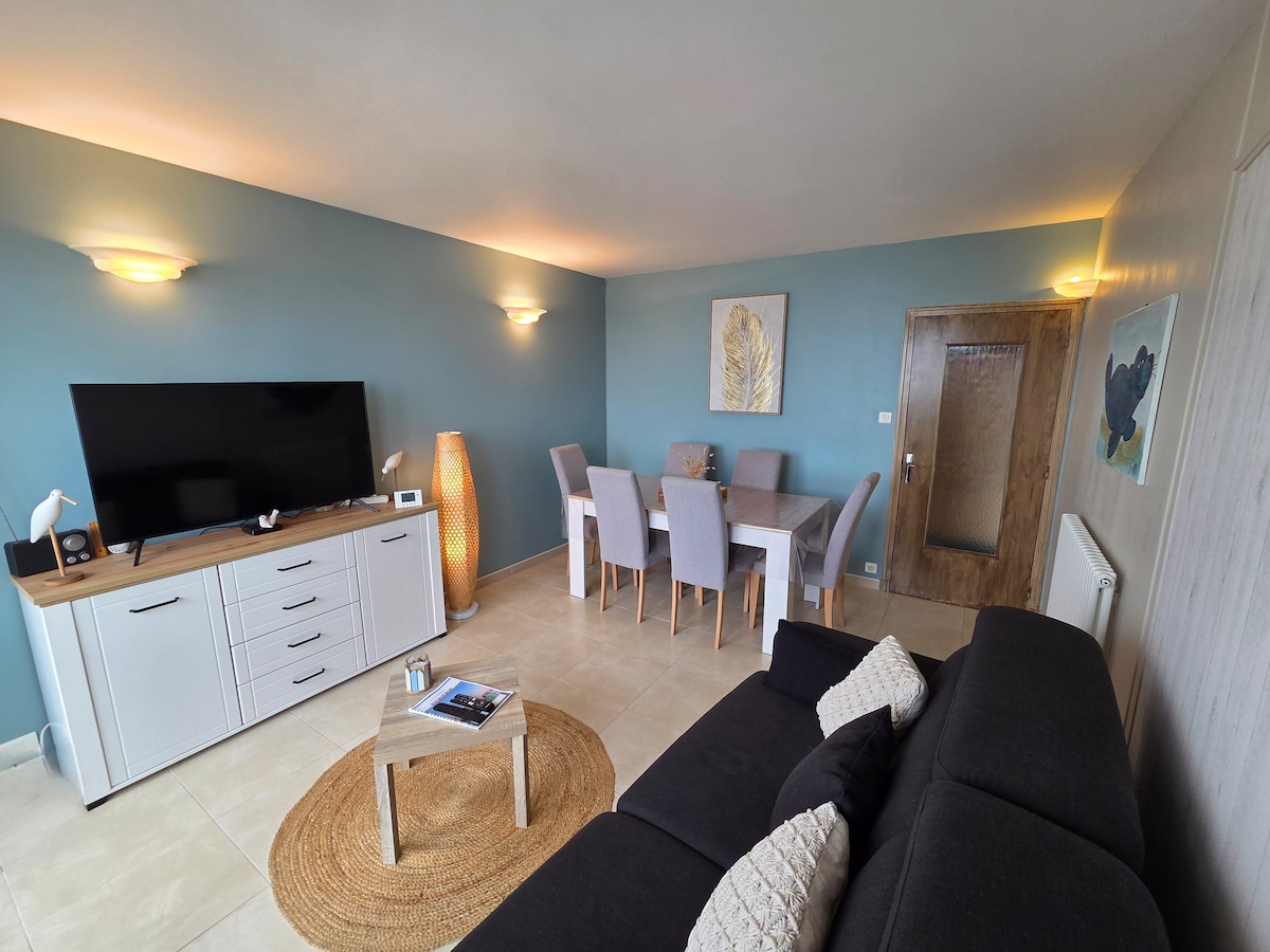 Déjeunez, lisez, contemplez la mer 🌊 depuis le séjour de cet appartement cosy avec balcon sur la Côte d'Opale avec arrivée autonome. ✅ Les points forts 🌅Vue mer 180° 🪟 Grande baie vitrée et balcon 6 m² 🚗Garage privatif (1 place) 📶Wifi +TV connecté ✨Appartement rénové de 54 m², cosy et lumineux, à la déco épurée. 🏖️Tout à pied : plage, commerces, restaurants, casino… et balade pour observer les phoques (selon les marées). 👶Bébé bienvenu : lit parapluie + chaise haute sur place
